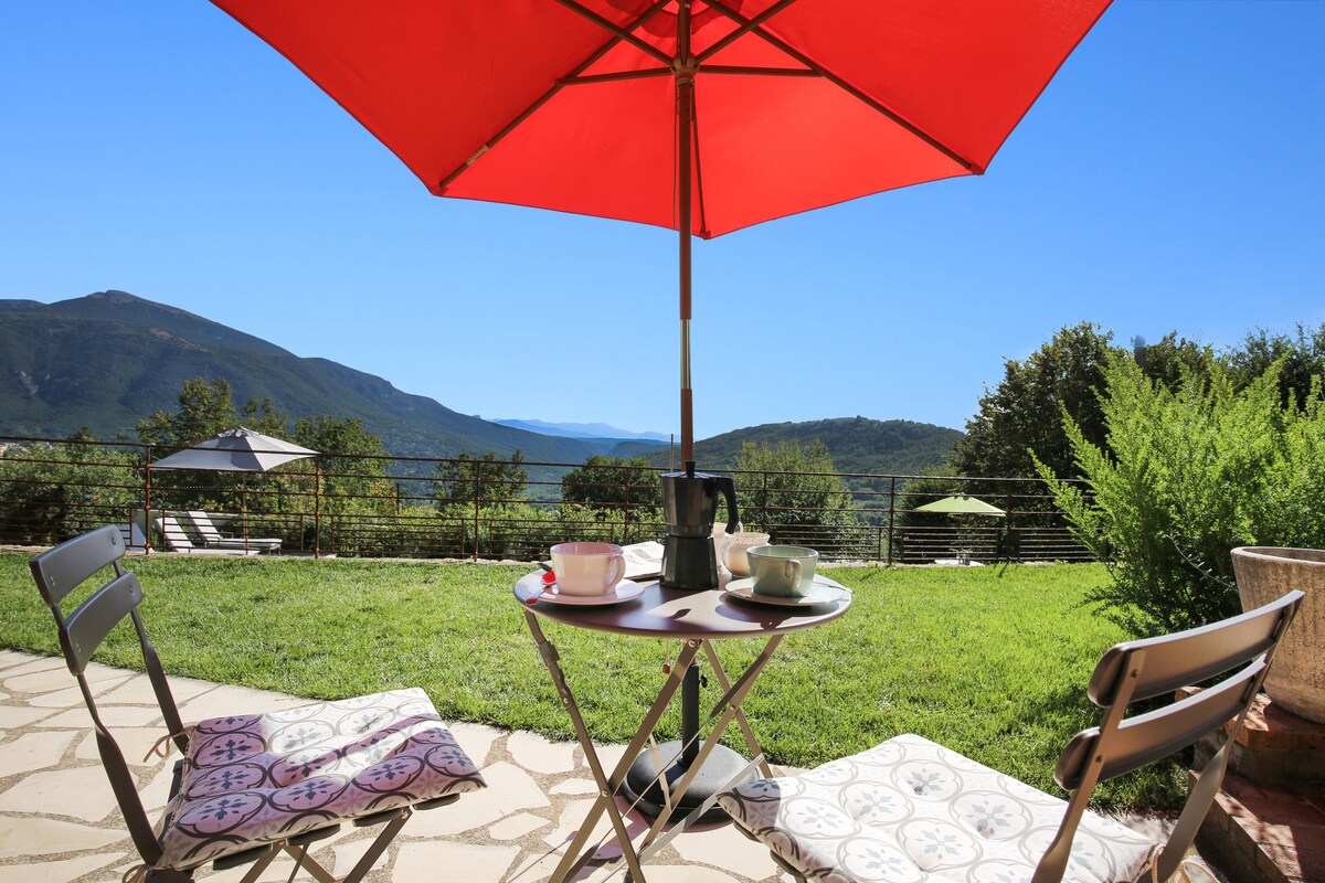 En studioleilighet med fantastisk utsikt og en solrik balkong. Selv om det travle livet i Côte d'Azur-strandområdet ligger bare 25 minutter unna, er vi i den regionale naturparken Préalpes d'Azur, full av muligheter for utendørsaktiviteter som bading i elven og naturskjønne stier. Studioleiligheten har tilgang til et basseng (mai til oktober). Vær oppmerksom på at dette stedet er røykfritt. Eierne er ivrige syklister, og huset er utstyrt med et grunnleggende verksted og sykkellagring for gjestene.
