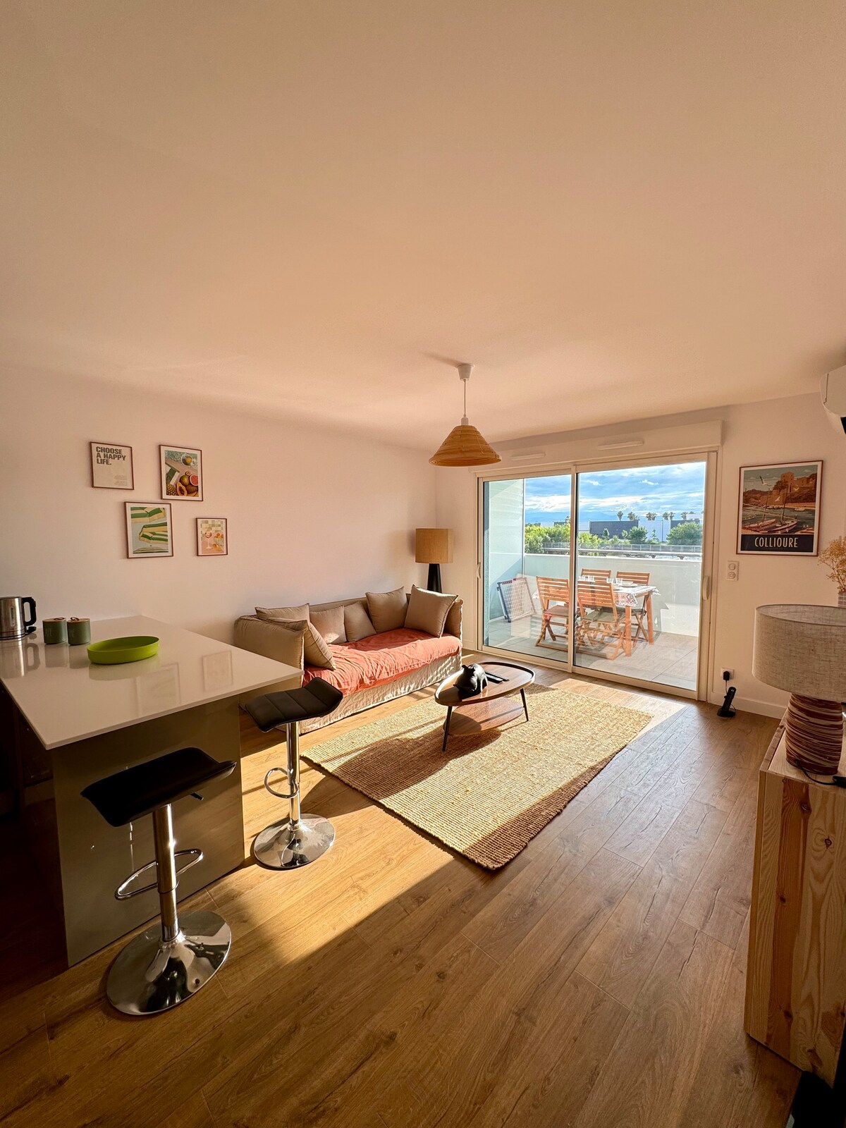 Luksusleilig på marinaen med utsikt over Canigou og solnedgangen for 4 personer, med klimaanlegg 1 soverom med seng på 160 cm og garderobeskap 1 soverom med kvalitetsseng i 140 og garderobeskap kjøkken med sentralt kjøkkenøy, alle redskaper for matlaging, nespresso kaffemaskin, brødrister... to store vinduer åpner seg til en stor terrasse med markise alle butikker ligger 50 meter unna, felles svømmebasseng, tennis, stadion private parkeringsplasser utleie fra lørdag til lørdag
