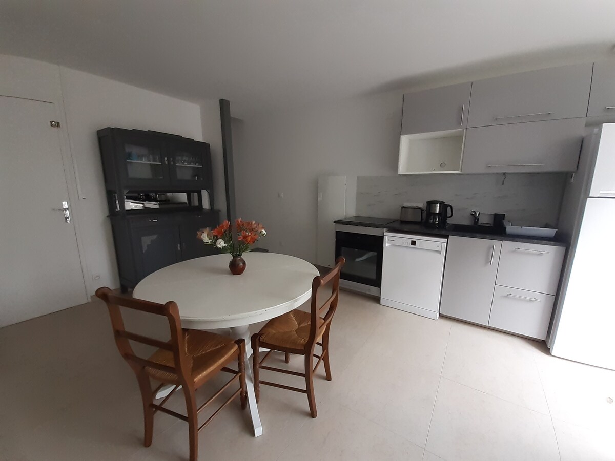I en sjarmerende eiendom (gammelt renovert gårdshus) på 3ha, natur og ro på møteplassen. Ferieutleie på 60 m2 bestående av: - Første etasje: et utstyrt kjøkken/spiseplass (elektrisk komfyr, kjøleskap, vaskemaskin, miniovn, kaffetrakter...). - Etasje: ett soverom (en dobbeltseng + en enkeltseng + en stue, TV). Badet (dusj + badekar), toalett. Trådløst nettverk. Hage, terrasse, hagemøbler + grill.