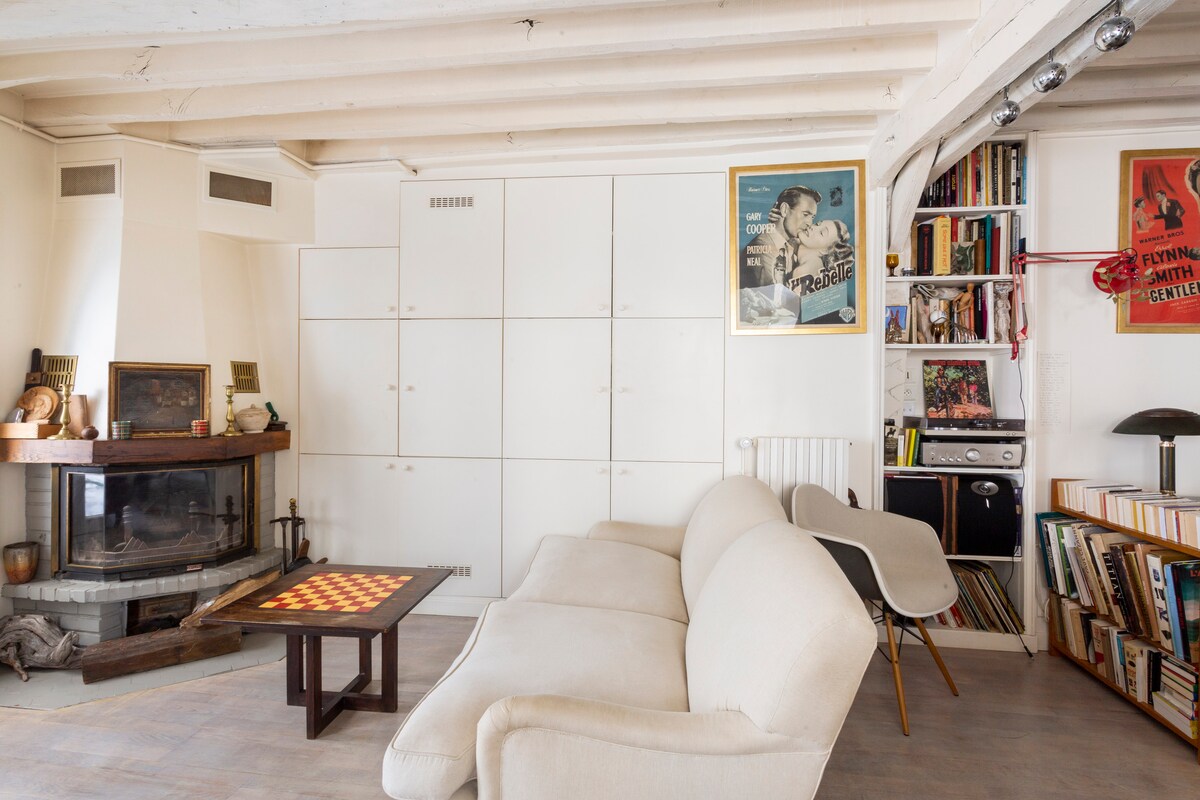 Sjarme og komfort i andre etasje i en bygning fra det 16. århundre (tredje etasje for amerikanere), i en rolig blindgate, men likevel i sentrum av Paris. Synlige bjelker, fliser, moderne innredning, kunstverk fra hele verden, stor stue på 50 m2, 2 soverom og 2 bad, livlig og kommersielt område, all transport i nærheten. Lenestol som kan gjøres om til en seng i stuen (utfoldet er sengen 80 cm x 190 cm). Merk: det er ingen heis.