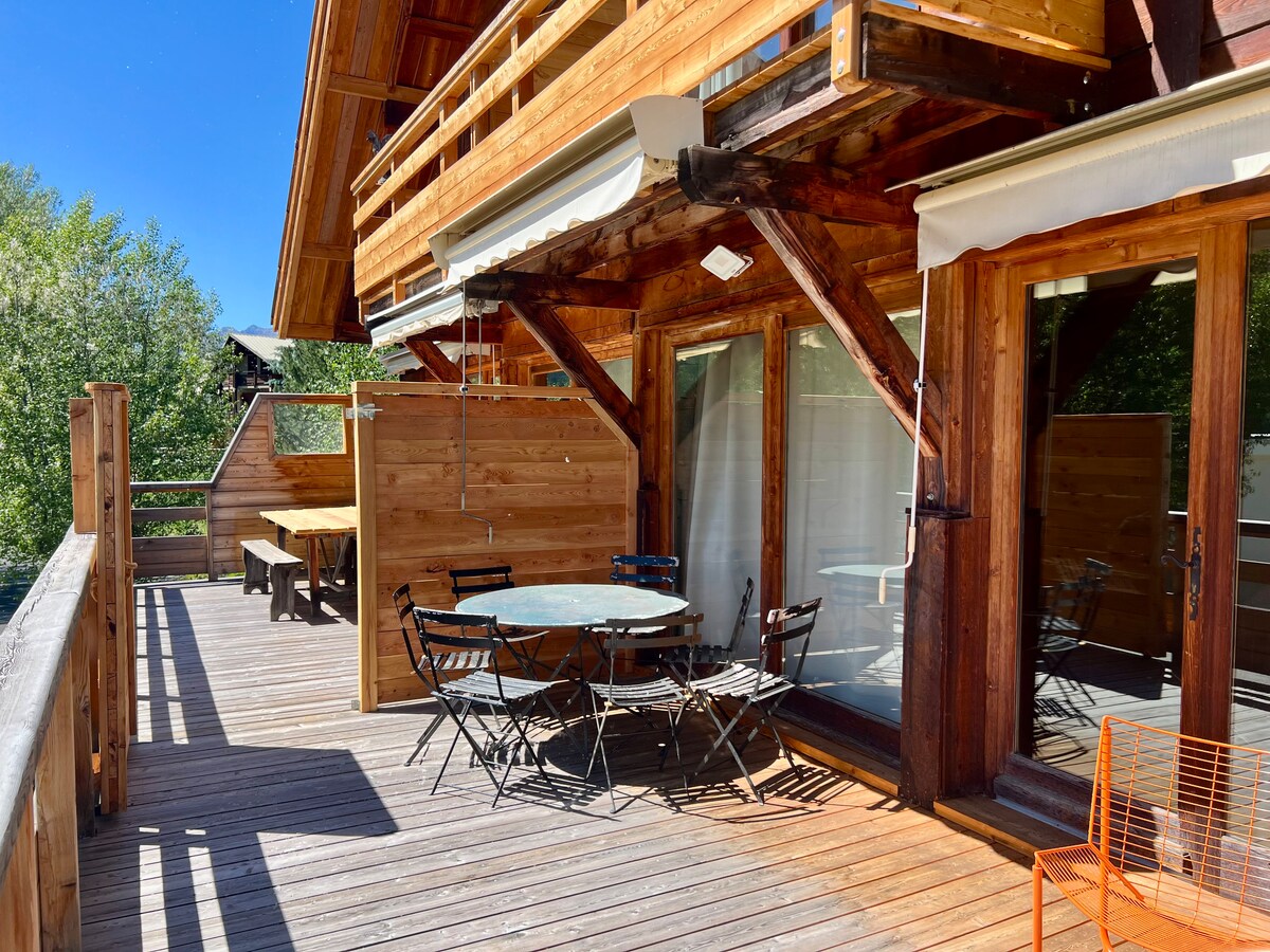 Bienvenue au chalet Le Carré de Bois ! Idéalement situé sur les hauteurs de Briançon, notre chalet propose une ambiance chaleureuse, une vue exceptionnelle, une décoration choisie et des équipements de confort vous garantissent un excellent séjour dans nos montagnes ! Baignés de soleil, la terrasse et le jardin vous permettront de profiter du ciel bleu et de la superbe vue sur les sommets environnants.