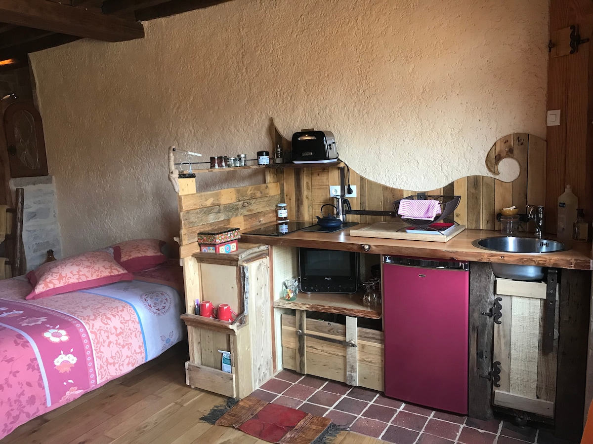 På en privat eiendom på mer enn 3 ha, inkludert vårt hus og en liten stall, ligger hytta på 35 m2 rett ved kanten av en vannkilde på 700 m2 og kan ta imot opptil 4 personer. Den består av et dusjrom, et utstyrt kjøkken, en stue, et soverom med en queen size seng og en hems med to senger på 90 cm. Du vil ha tilgang til en stor hage som er anlagt ved vannkanten, og en vedovn for kjølige kvelder.