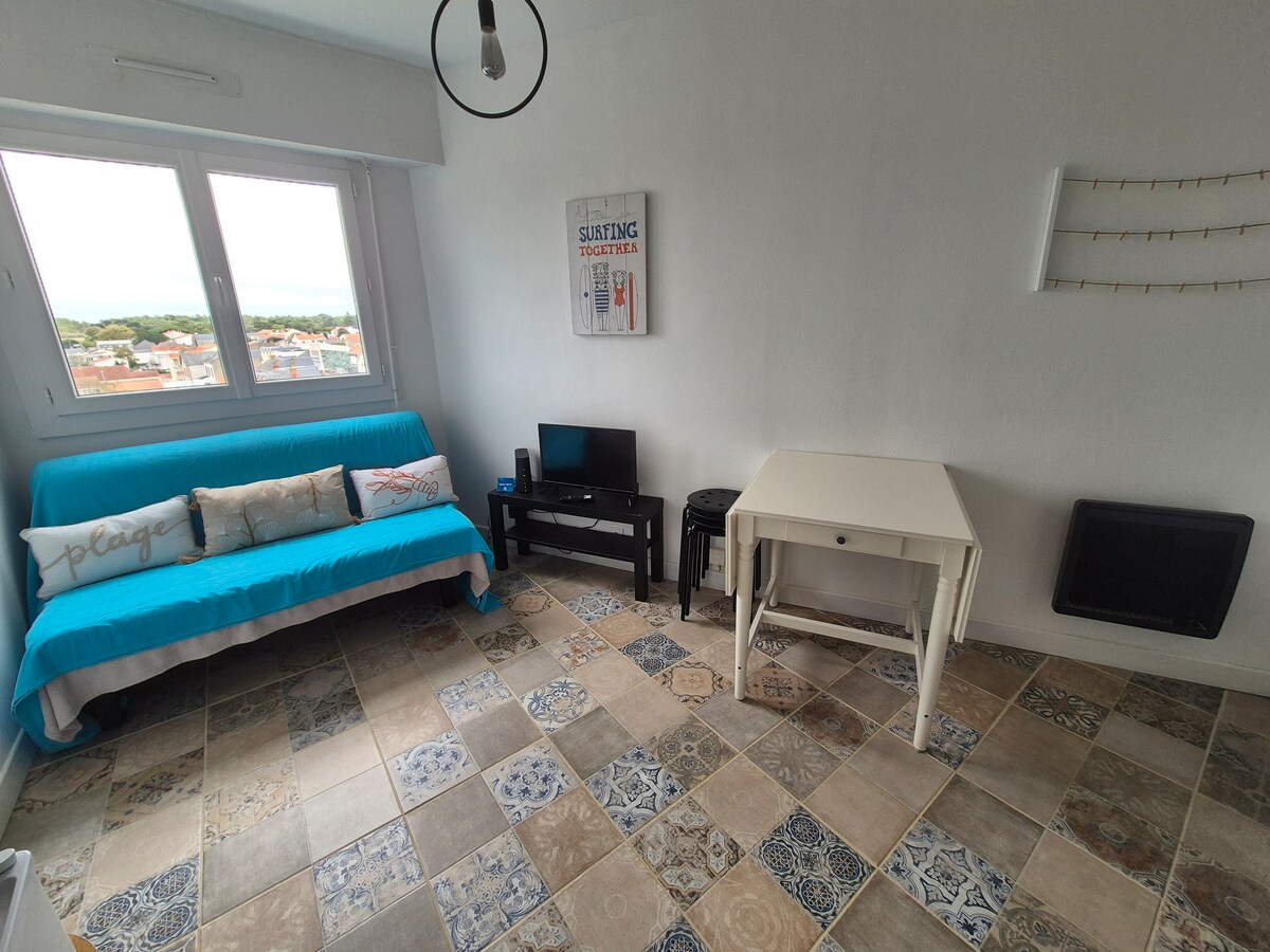 Mot sjøen: nyt et eksepsjonelt panorama. Fantastisk T2-leilighet (2/4 pers) renovert i 2024 – HØY KOMFORT. Stranden og sanddynen ligger rett utenfor leiligheten (ingen vei å krysse). Bemerkelsesverdig utsikt over havet og Île d'Yeu fra spiseområdet, loggiaen og til og med fra sengen på soverommet. Nyt solnedgangen sammen med din kjære, familie eller venner. Du har din egen lukkede garasje, ideell for bilen din og for å oppbevare sykler, tilhengere og strandleker.