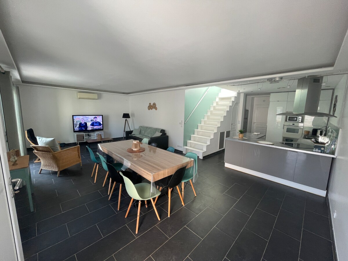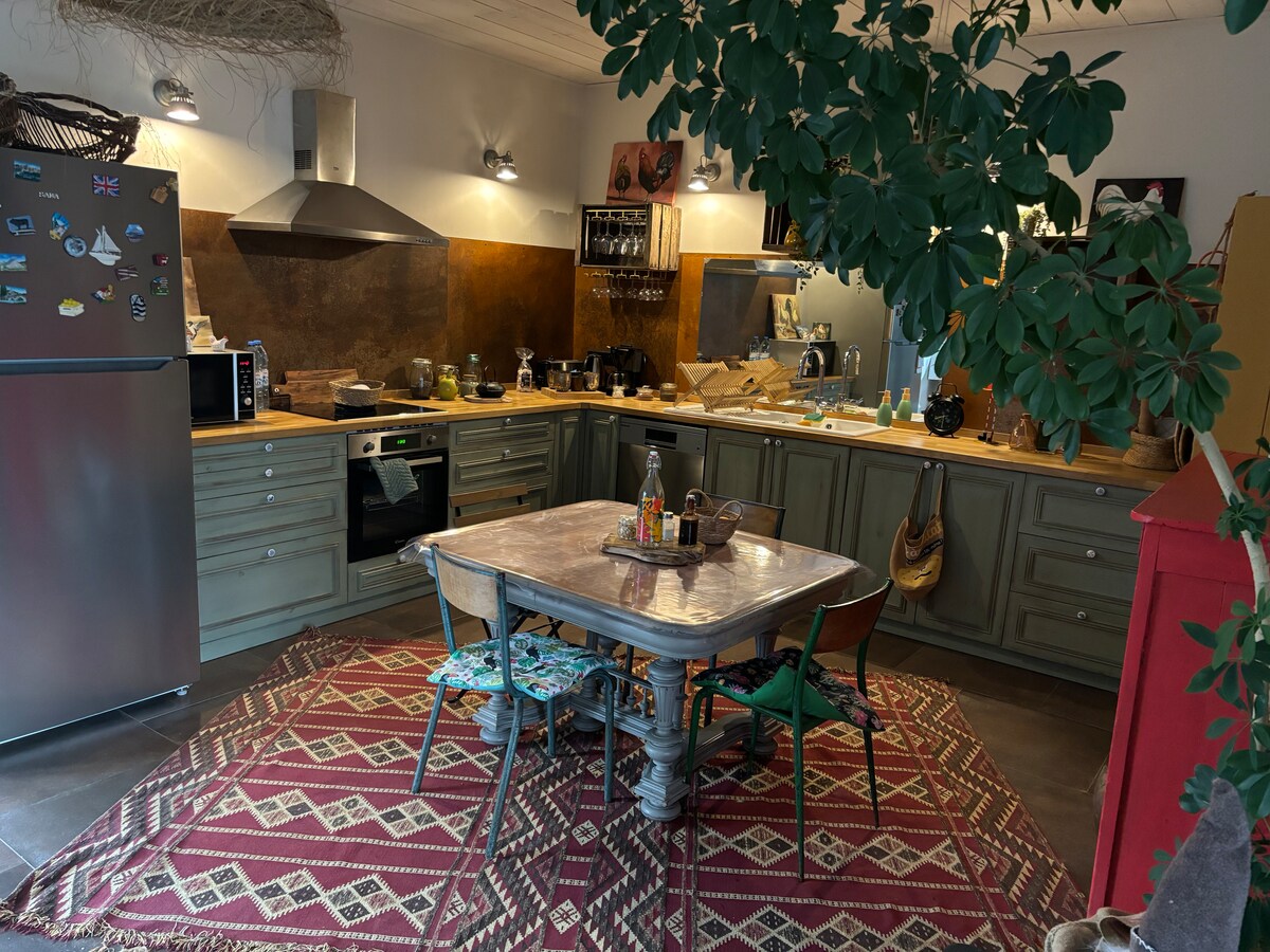 Hytte på 150 m2 renovert i Medoc med privat spa (som er åpent hele året). Hage bak huset vendt sørover og helt inngjerdet på 450 m2 med stor grill i utendørs peis + garasje + parkering foran huset. Den består av en spisestue, kjøkken med oppvaskmaskin, 3 soverom med hvert sitt eget bad, 2 toaletter, garasje, TV, wifi. For å underholde deg, er boligen utstyrt med et biljardbord, et bordtennisbord, dart.