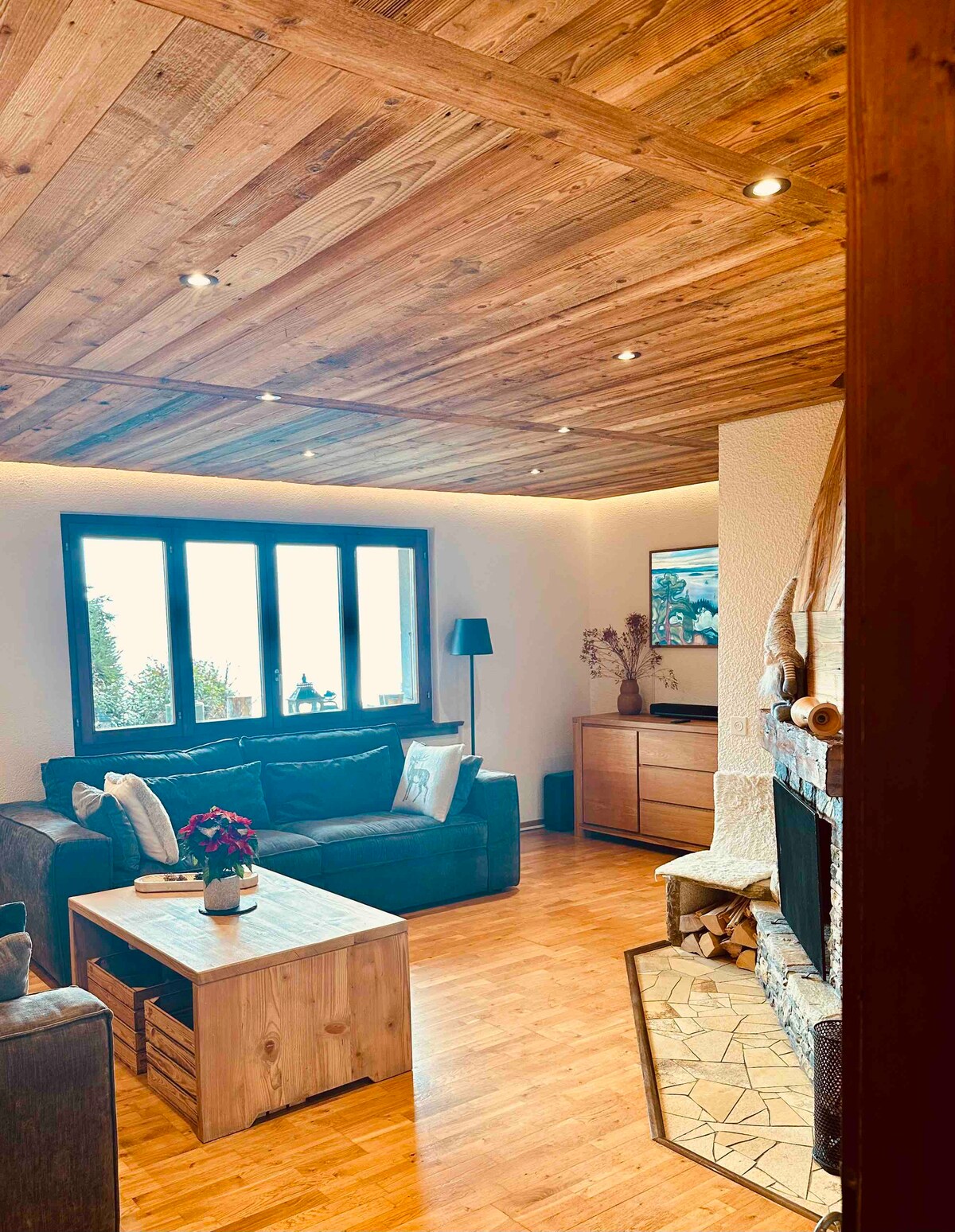 Herlig individuell hytte, veldig fredelig, med vakker hage, terrasser og balkonger vendt sørover. Den har fantastisk utsikt over de sveitsiske Alpene. Denne hytta er bygget i en tradisjonell ånd med hjelp fra lokale håndverkere, og er oppgradert gjennom årene. Den er et ekte kunstverk, unikt i sitt slag. Med sine mange integrerte utskårne oppbevaringsløsninger i tre, de unike møblene, kombinerer den moderne komfort med sjarmen fra gamle dager, og den vil forføre både familier og elskere av autentisitet og ro.