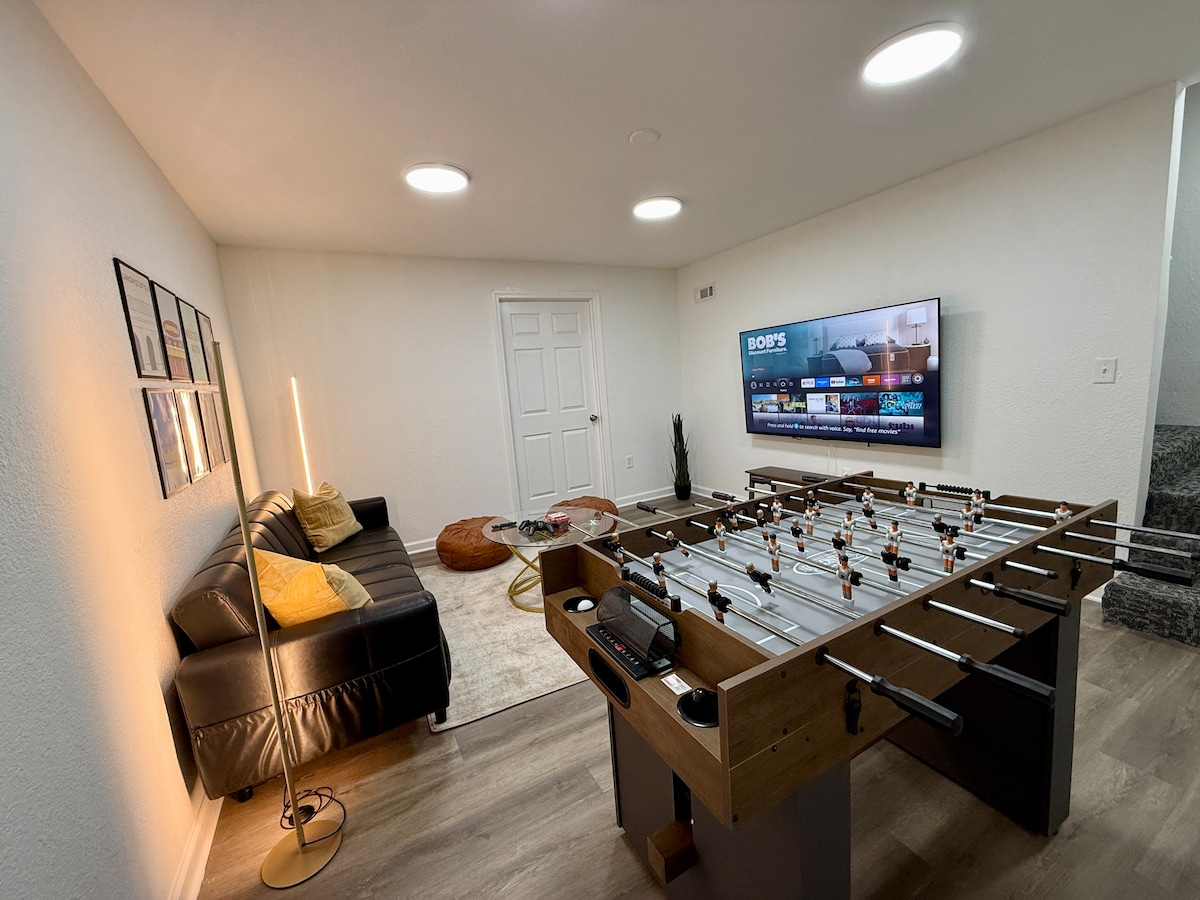 Spacious three-level retreat in the Village West Entertainment District, minutes from Legends Outlets, Kansas Speedway, Sporting KC, golf, restaurants, and shopping. Sleeps up to 14 guests with 4 bedrooms, loft sleeping area, and 4 full baths with bidets. Enjoy a sport court for pickleball/basketball, swim spa, gym, arcade, pool table, ping pong, darts, shuffleboard, mini golf, and more. Overlooks Sunflower Hills Golf Course.
