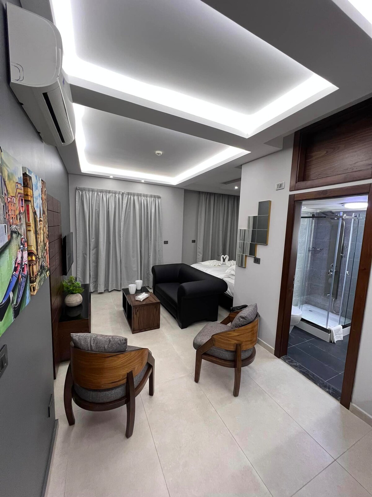 Modern boutique room in Mar Mikhael, Beirut, designed for comfort and practicality, set in a new and secure building. Situated just a 1-minute walk from Tavolina Mar Mikhael, a 2-minute drive from The Bros, and a 3-minute drive from Starbucks, this fully equipped room is ideal for solo travelers or couples looking for a central, well-connected stay.