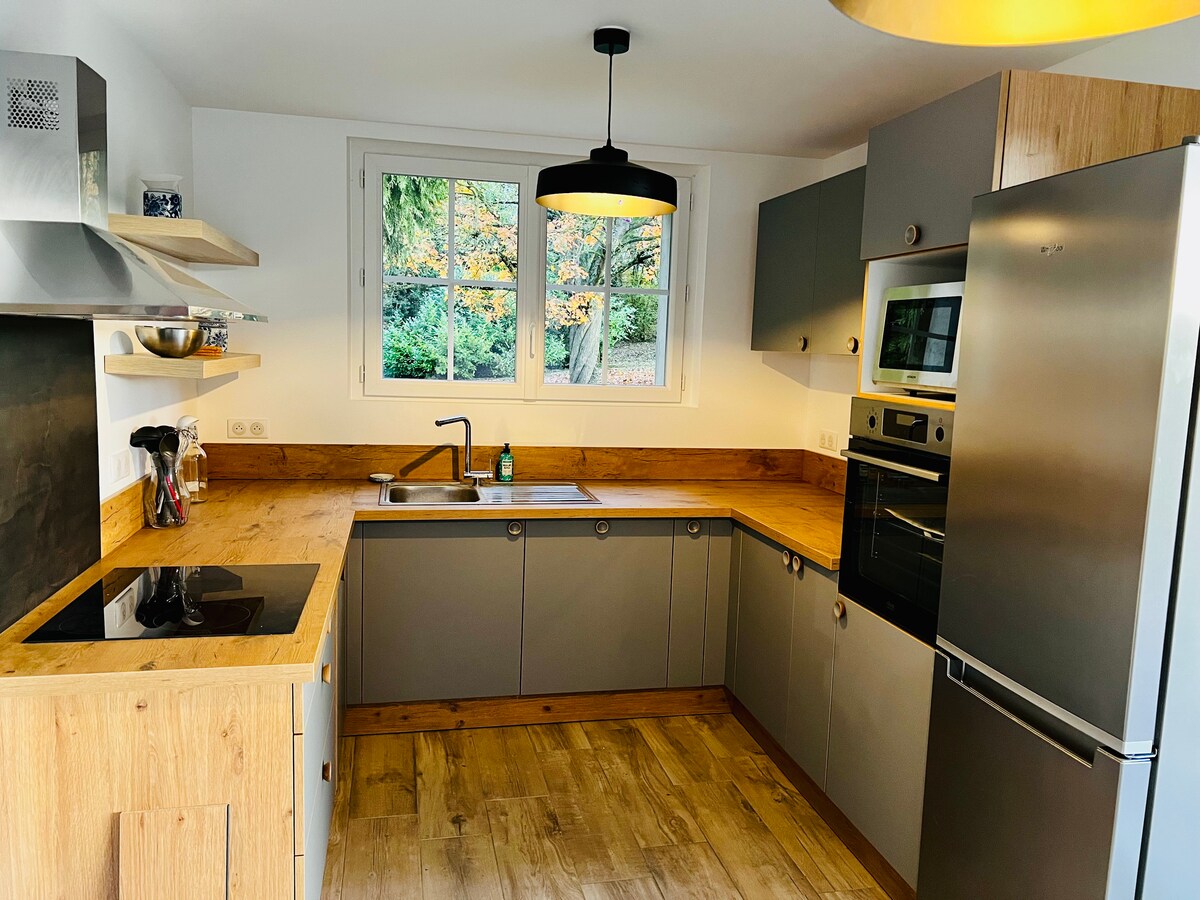 Rekkehus med terrasse og hage, som ligger ti minutters gange fra sentrum, i nærheten av en skogkledd park. Komfortabelt hjem, ideelt for gjester, men også for arbeidende mennesker … DRC: Stue med TV og TRÅDLØST NETTVERK Spisestue åpen for utstyrt kjøkken . Bad Etasje: Dobbeltseng med 1 soverom 1 soverom 2 enkeltsenger på mesanin adskilt av en gardin. Trappen er bratt nok til å komme opp. Sengene er oppredd ved ankomst, pris for fire personer.