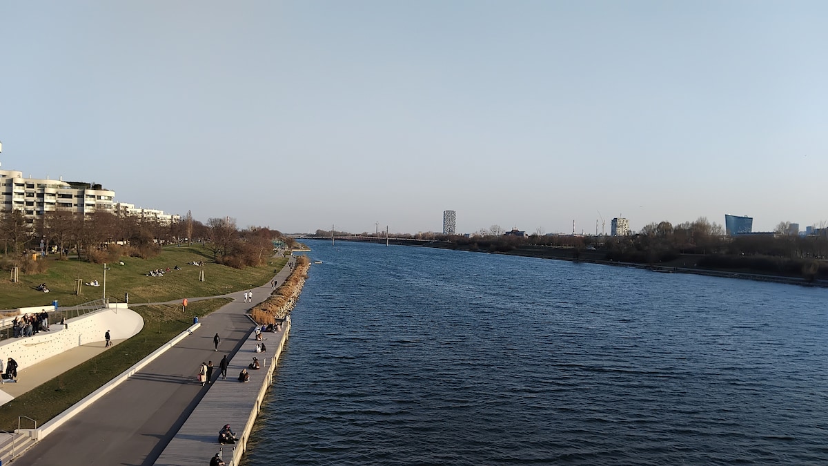 Leilighet med utsikt over vann/grøntområder. Gangveier direkte fra huset til naturen langs gamle Donau. Selvbetjening, garasjeplass direkte i huset kan leies for € 15 per dag, heis fra garasjen gjør ankomst/avreise enkel. T-banestasjonen Alte Donau (U1) ligger rett ved broen, 9 minutter til sentrum, svømmebasseng rett utenfor huset. TV med alle internasjonale kanaler, trådløst internett, stue og spisestue med utsikt over vannet, Fritidsmuligheter, sykling, jogging, supermarked overfor, svært gode restauranter