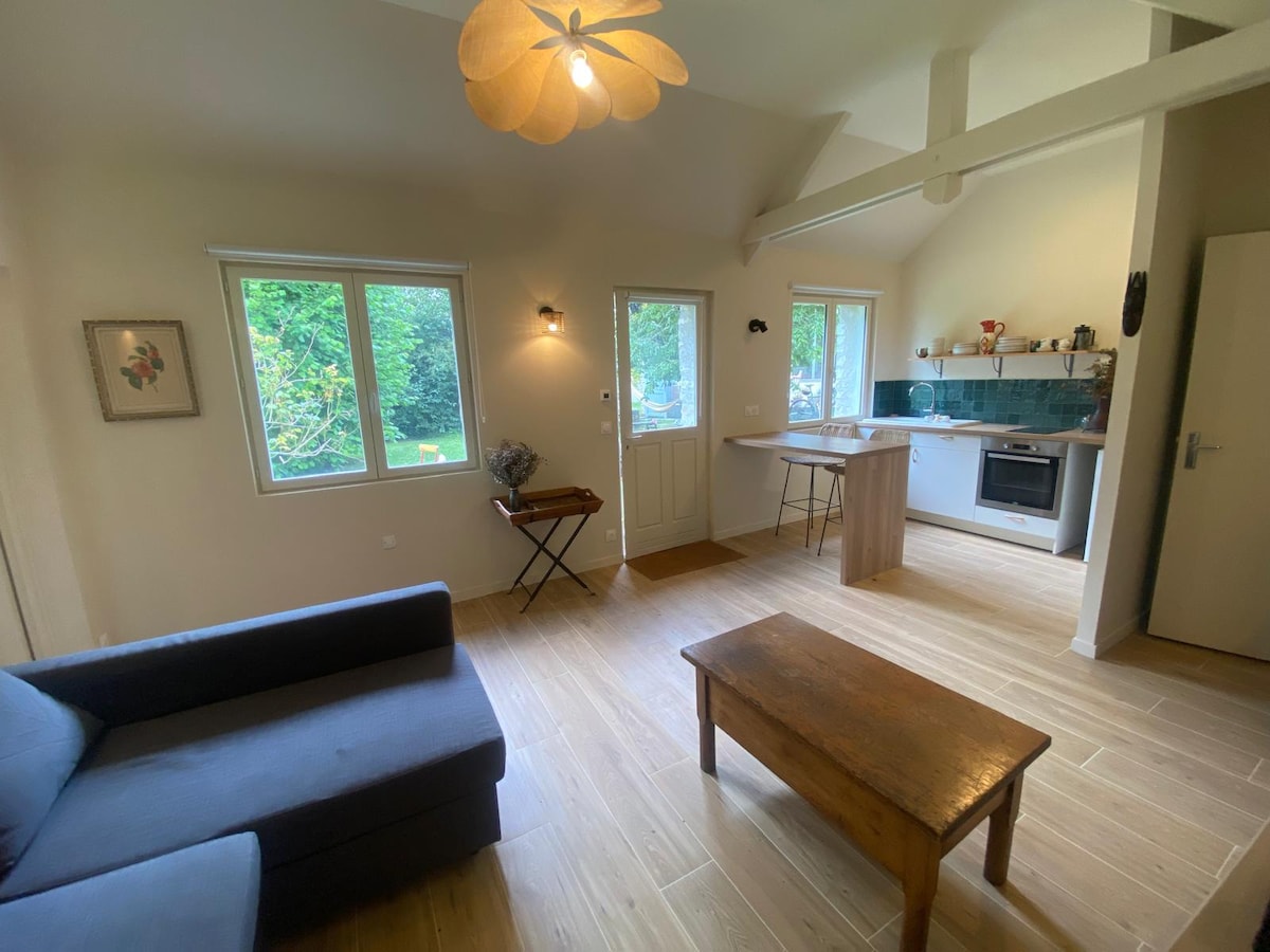 Fester og gjester uten tillatelse 🚫 Takket være steinene våre i gjestehuset forblir omgivelsestemperaturen behagelig, selv når det er varmere. Stort, fullt utstyrt, uavhengig studio på 45 m2 med mesanin og privat hage på stor, lukket eiendom. Passer for et par eller en familie med barn. Atypisk og grønn omgivelse nær Villennes togstasjon (linje J, direkte St Lazare på 22 minutter), eller RER A i Poissy og A13&A14-Paris motorveier 30 minutter unna. Parkering på eiendommen.