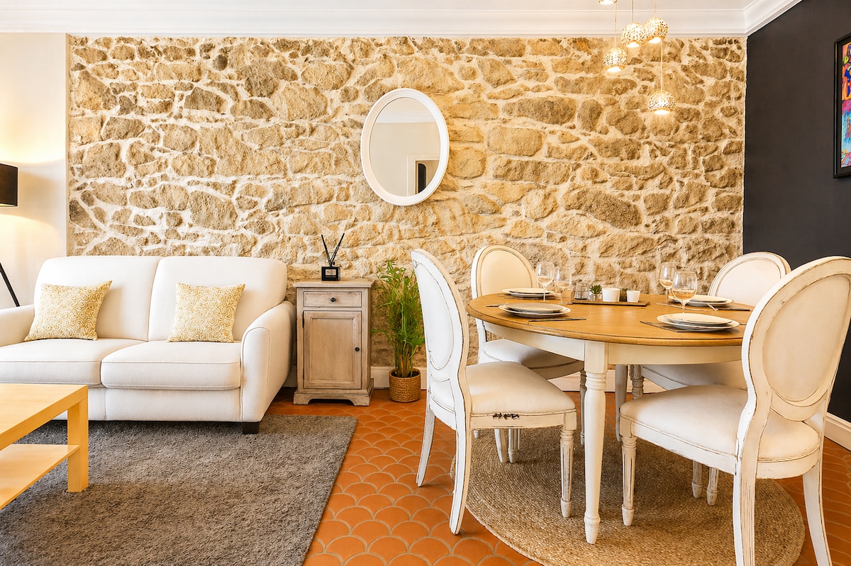 Denne lyse og luftkondisjonerte to-romsleiligheten ligger rett overfor togstasjonen og bare fem minutters gange fra Palais des Festivals, La Croisette og strendene. Den er ideell for både en forretningsreise og en ferie i Cannes. Leiligheten kombinerer moderne komfort og autentisk sjarm med den eksponerte steinveggen, og har plass til opptil fire gjester i en varm og perfekt utstyrt atmosfære.