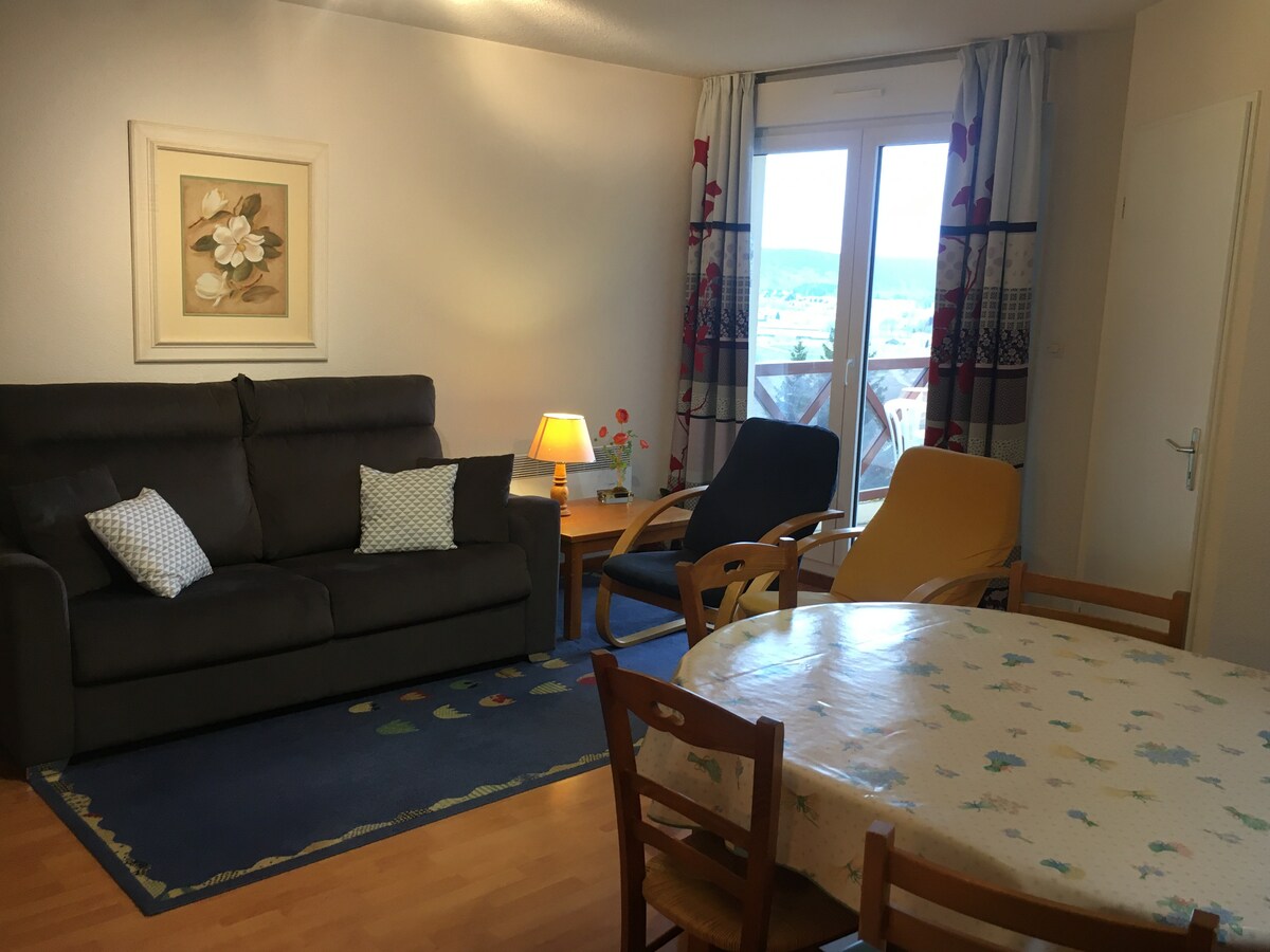 Velkommen til Jouv' ⛷️🏔️ Vårt varme og nyoppussede overnattingssted venter på deg, både sommer og vinter, for å nyte Jura-fjellene. ⚠️ : Leilighet i 4. etasje, uten heis. Beliggende ved foten av skibakkene "LES JOUVENCEAUX", vil du nyte en gjennomgående leilighet på 49m2, med et soverom og en sovesofa, svært komfortabel og modulær (160x200 eller 2 senger på 80x200). 🚙 : Garage Vi bor i denne boligen 1 uke av 2, så den er veldig godt utstyrt. 🫕