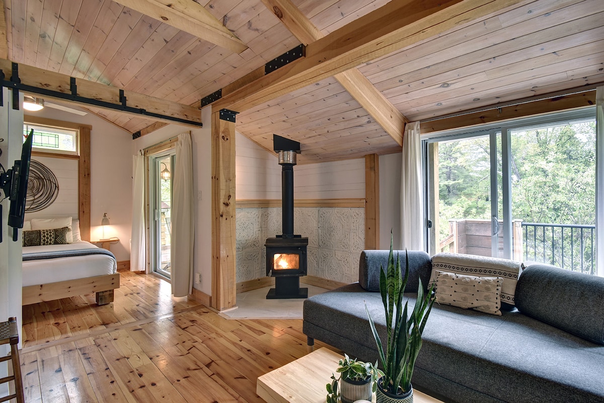 Domaine Rivière Rouge Mathys med spa åpent året rundt, med plass til 4 personer med en kingsize-seng og sovesofa i stuen. En unik opplevelse i hjertet av Laurentides, ved bredden av Joan-sjøen, 25 minutter fra Mont-Tremblant. Nyt spaet mens du lar deg vugge av roen og beundre landskapet. Tilgang til vannkanten, høyhastighets wifi, kajakker, padlebrett og en båt inkludert. Utendørs bål, ta med ved. Ingen kjæledyr tillatt.