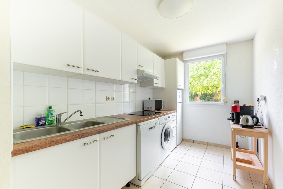 Velkommen til denne leiligheten med oppvarmet utendørsbasseng, privat hage med terrasse og hagemøbler. Det er det ideelle stedet for forretnings- og personlige opphold. 🏡 Ett soverom, ett bad, ett toalett 1 dobbeltseng + 1 sovesofa 🏊♂️ Felles oppvarmet basseng utendørs, åpent i sesongen. 🖥️ fullt utstyrt kjøkken, trådløst nettverk, vaskemaskin, oppvaskmaskin, kaffetrakter 🧺 Sengetøy og håndklær inkludert 🧹 Rengjøring ved slutten av oppholdet 🅿️ Gratis parkering. 🛎️ Innsjekking uten vert fra kl. 16.00