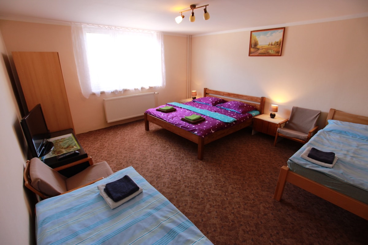 Tenk deg å våkne opp i sentrum av Spis (en historisk og naturlig perle i Slovakia), i nærheten av det majestetiske spiselottet, den historiske byen Levoča, de høye tatraerne og den slovakiske paradisets nasjonalpark. Tre romslige rom og stue med peis minner deg om varmen i hjemmet. Transport deg til en avslapningsoase på terrassen i en privat hage med grill og i vårt private velvære med jacuzzi, utedusj og finsk badstue. Velvære mot en ekstra kostnad.