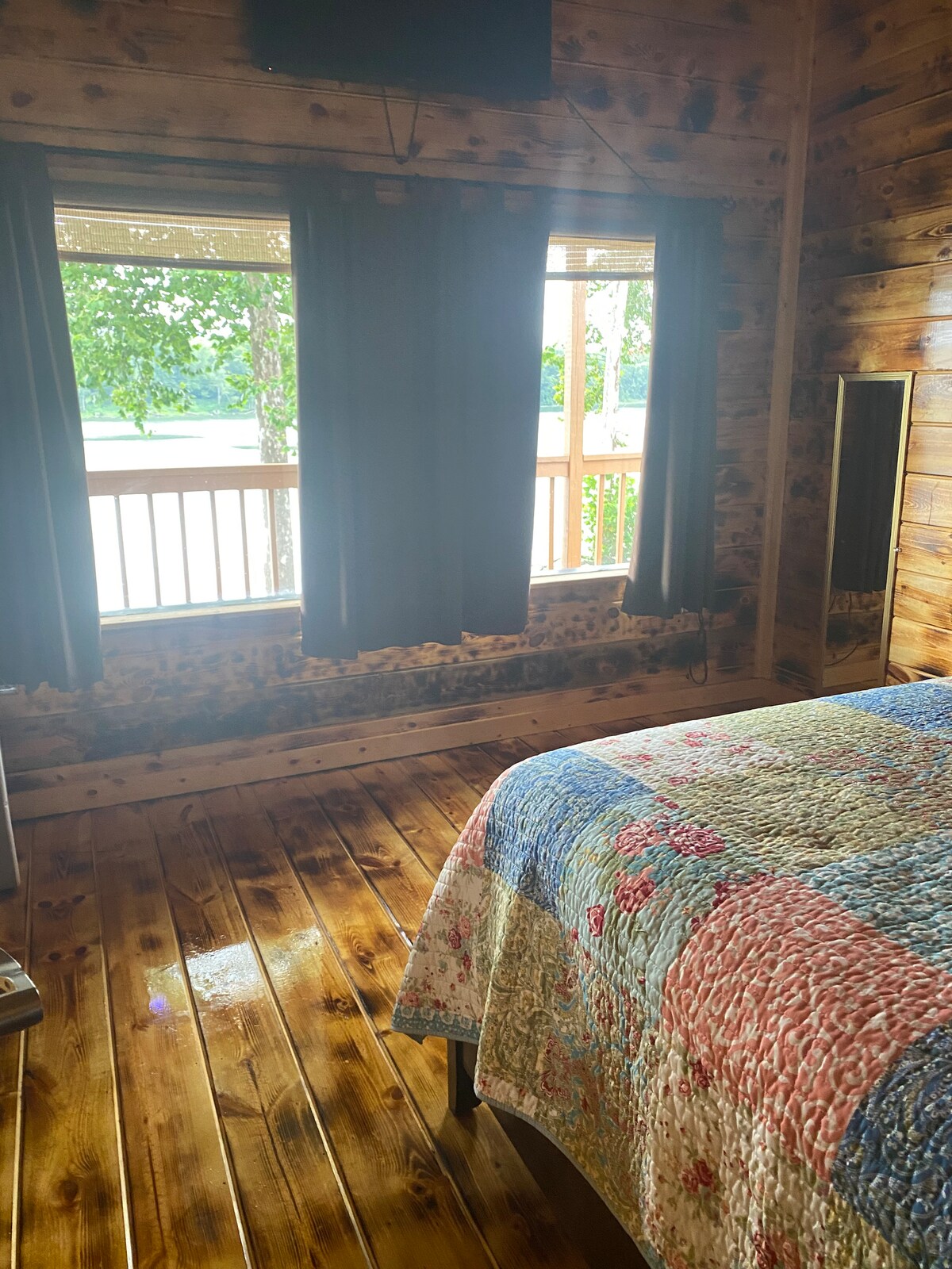 If you love being around water this place is for you. You can go fishing, Watch boats, Jet ski's. Or you can even bring your own boat or jet ski. The boat dock isn't far from the camp. Their is also a playground by the boat dock to take the kiddos to. The Kitchen is also outdoors. The bathroom is downstairs enclosed to takes showers keep in mind when your done taking a shower and you open the door it you might get a little cool if you stay during fall. There is no running water upstairs.