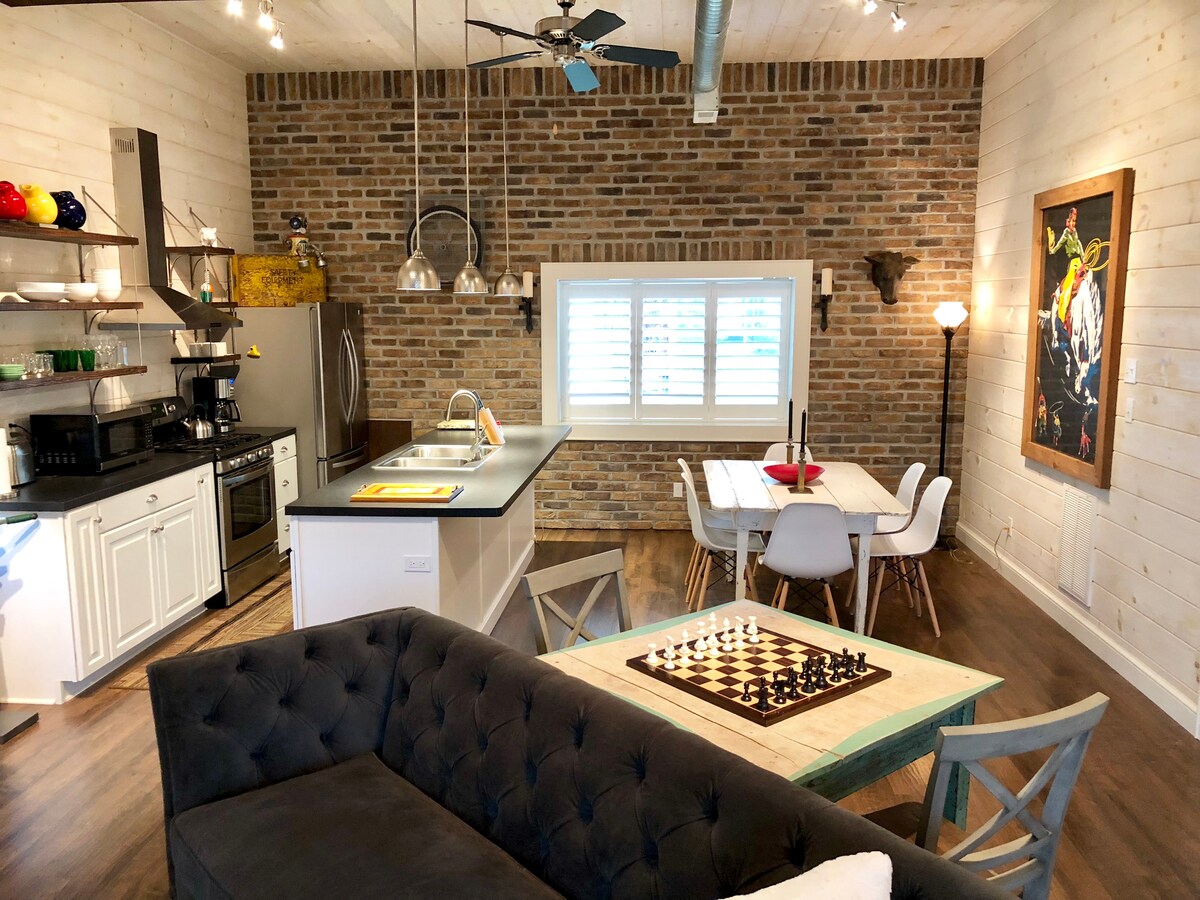 Du vil føle en umiddelbar følelse av ro når du kommer. Gå gjennom en parklignende omgivelse omgitt av trær og frodig landskap til et privat, solfylt hjem med vintage sjarm, tregulv, høyt tak, originale kunstverk og høye vinduer. Denne nyrenoverte, historiske duplexen (øverste etasje uten trapper) har egen inngang og balkong med naturskjønn utsikt for den ultimate ferien. Bare 1 1/2 kvartal fra byen, har du en enkel 5 minutters spasertur til alt det kuleste småbyen i Amerika tilbyr.