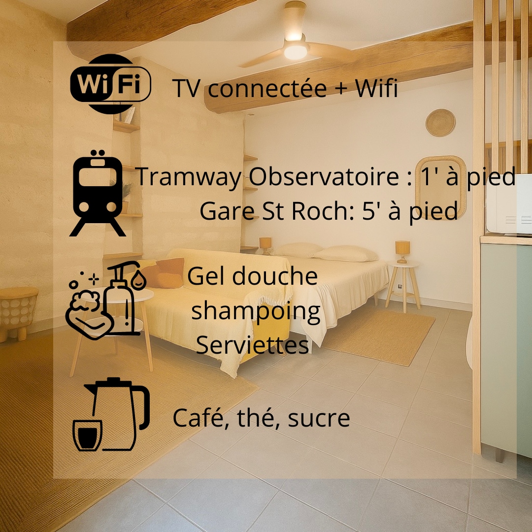 Vakker romslig og lys leilighet med terrasse, klimaanlegg, gratis parkering og fantastisk utsikt fra havet til Pic Saint Loup. Ideell beliggenhet i sentrum, en kort spasertur fra Gare Saint Roch i det historiske sentrum, samt stasjoner med fire trikkelinjer. I niende etasje i en ny bygning kan du nyte roen på stedet, samtidig som du er i nærheten av tjenestene og underholdningen i byen.