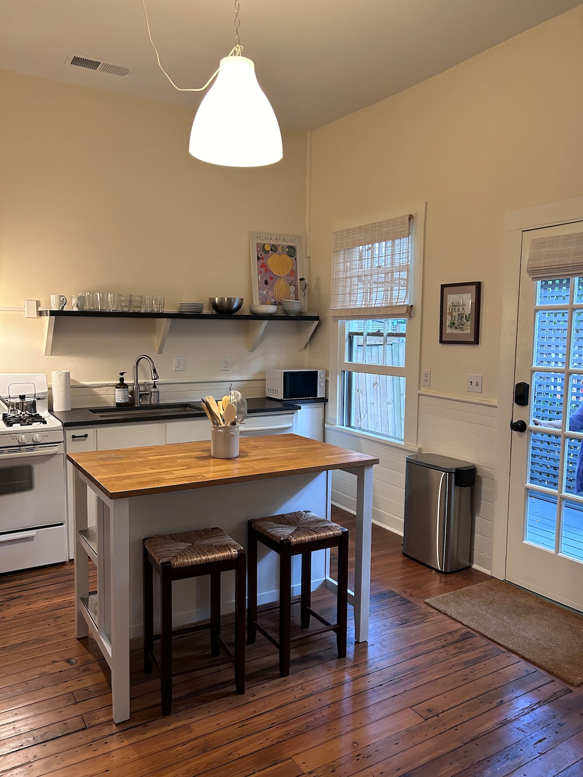 Sjarmerende ettromsleilighet i et vakkert nabolag som er enkelt å komme seg rundt i til fots, like sør for Forsyth Park, og fullt av eklektiske butikker, restauranter som er populære blant matelskere og kule barer. Gratis sykler for å hjelpe deg med å utforske, og den gratis DOT-shuttlebussen stopper i nærheten. Vi ligger i populære Thomas Square / Starland, i nærheten av Forsyth Park (0,5 mi) og Historic District (ca. 1 mi). Tybee Beach ligger ca. 25 minutter unna med bil. Etter å ha utforsket, kan du vende tilbake til ditt hjem borte fra hjemmet til en fredelig hage borte fra alt.