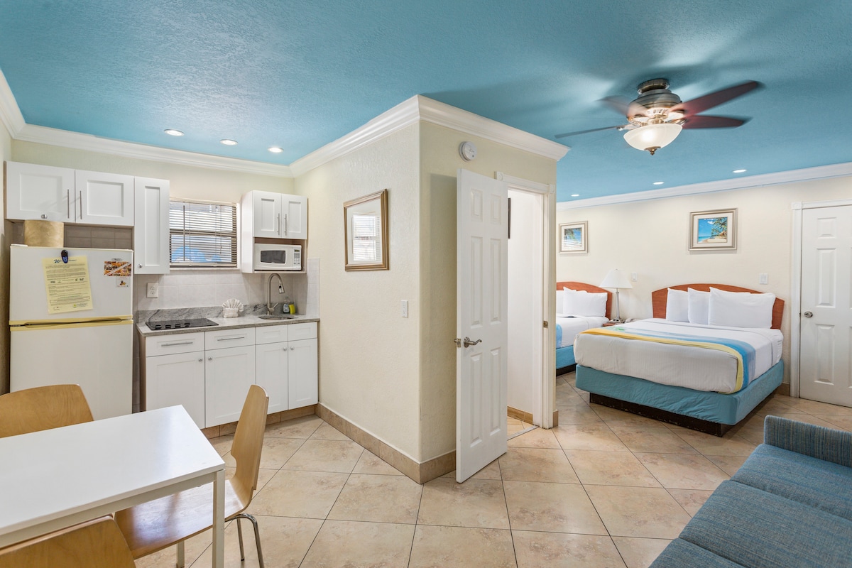 Helt nytt og oppdatert hotellrom-Condo på Ramada Inn på 41. Første etasje, to store, komfortable queensize-senger, 70" smart TV med kabelkanaler, sterk TRÅDLØST NETTVERK. Helt ny dusj, sminke, kaffe/te med kjøleskap og mikro. Oppvarmet basseng, tilgang til treningsstudio, Tiki Bar og Grill med daglig måltid og drikke. Livemusikk også! Vakre marina trinn fra døren...Ta med båten eller lei en! Minutter med bil til SRQ lufthavn, USF, New College, IMG Academy, Downtown Sarasota, St. Armand 's Circle og alle strendene i området!