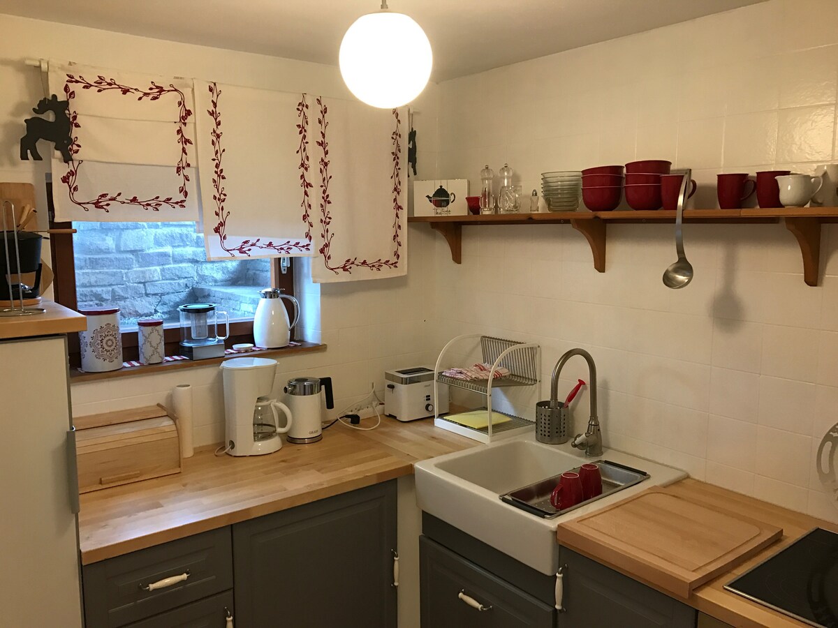 Føl deg komfortabel i leiligheten i første etasje, med en stor hage og en fantastisk hagesalong. Med fantastisk utsikt mot de omkringliggende fjellene, kan du tilbringe en flott pause her. Leilighet ett er utstyrt med 2 soverom, bad med toalett og dusj. Kjøkkenet er fylt med tallerkener, kaffemaskin, vannkoker. Hårføner håndklær og sengetøy er tilgjengelige. Tørketrommel og vaskemaskin i kjelleren samt tørkerom, sykkel og skirom for alle.