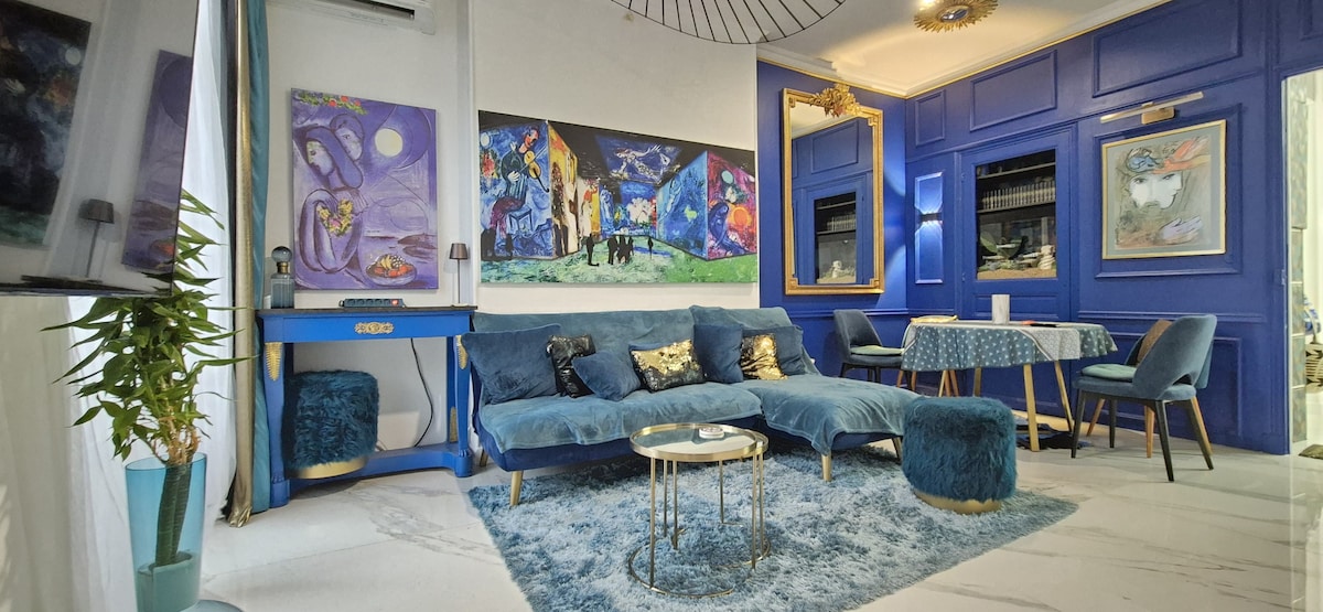 Nyt hvert øyeblikk når sollyset danser på overflaten av det fantastiske blå havet foran deg, mens du nyter frokosten din på det romslige kjøkkenet eller på den solfylte balkongen. NYTT i NICE! En 60 kvadratmeter stor leilighet + 2 balkonger, kun reservert for deg! Gloria Golden Blue-leiligheten har en enorm «Cal King Size»-seng på minst 2,1 m × 1,8 m, den største tilgjengelige i distriktet! Intim utsikt over sjøen fra sengen de første øyeblikkene av dagen. Boblebad-alternativ + premium velkomstdrink.