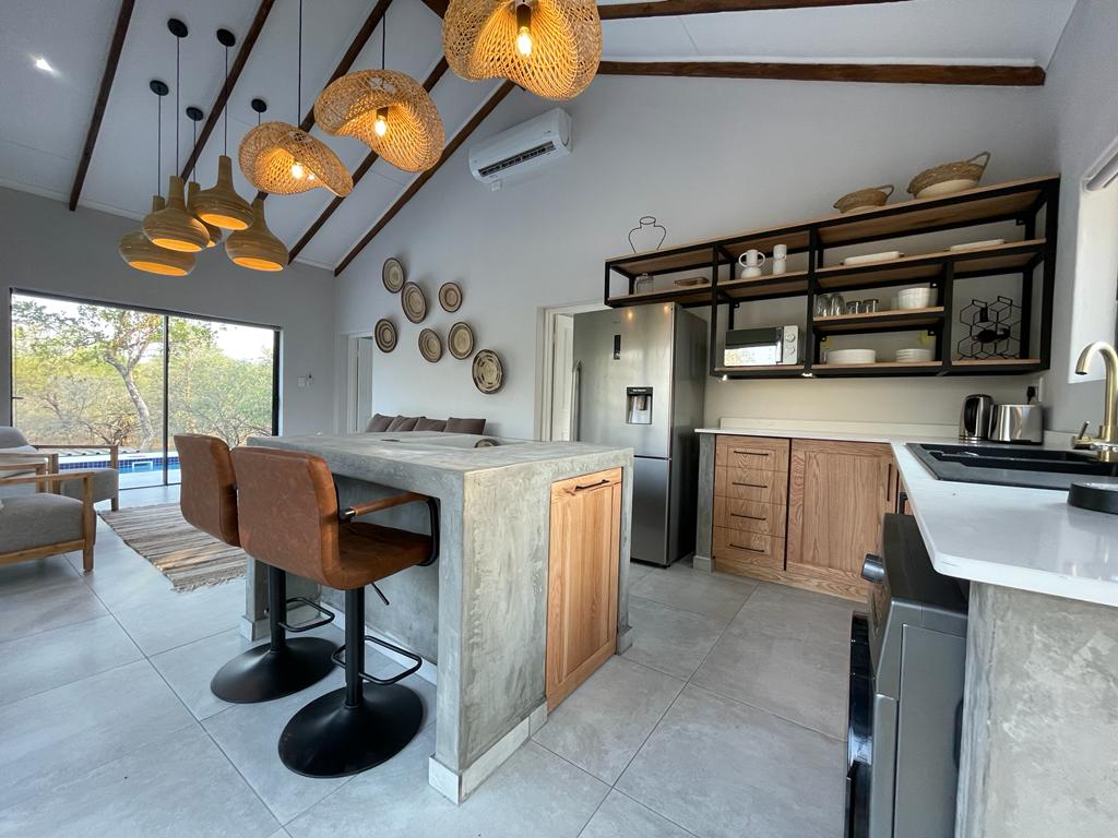 Dette unike stedet har en helt egen stil. Et moderne A-rammehus ligger i hjertet av bushen, grenser til Kruger nasjonalpark i Marloth Park. Denne unike eiendommen lover en unik opplevelse med en blanding av moderne og naturlig skjønnhet. Huset er badet i naturlig lys, takket være høye tak og store vinduer, noe som skaper en luftig atmosfære. Rene linjer og lyse interiører definerer det moderne designet, og gir et komfortabelt og stilig tilfluktssted.