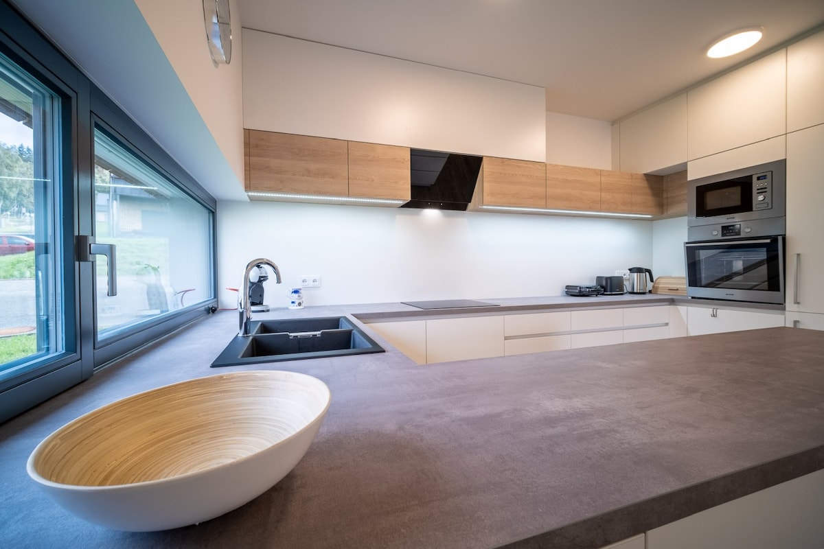 Helt nytt feriehus med stor garasje, stilige møbler, med 4 terrasser, som ligger bare 120 meter fra Windy point-stranden og YC Černá seilklubb, beste feriested på tsjekkisk, Perfekt for familier og venner. Beste plassering på tsjekkisk for Yachting, Windsurfing, Kiting, MTB, etc. det største vannet på tsjekkisk rett foran huset. 100m2 stueareal, gulvvarme, 139cm Smart Led-TV, Sat, Oppvaskmaskin, Peis, 2x WC, Dusj, vaskemaskin, garasje, bordtennisbord, grillgreier, 4x terasser, hage.