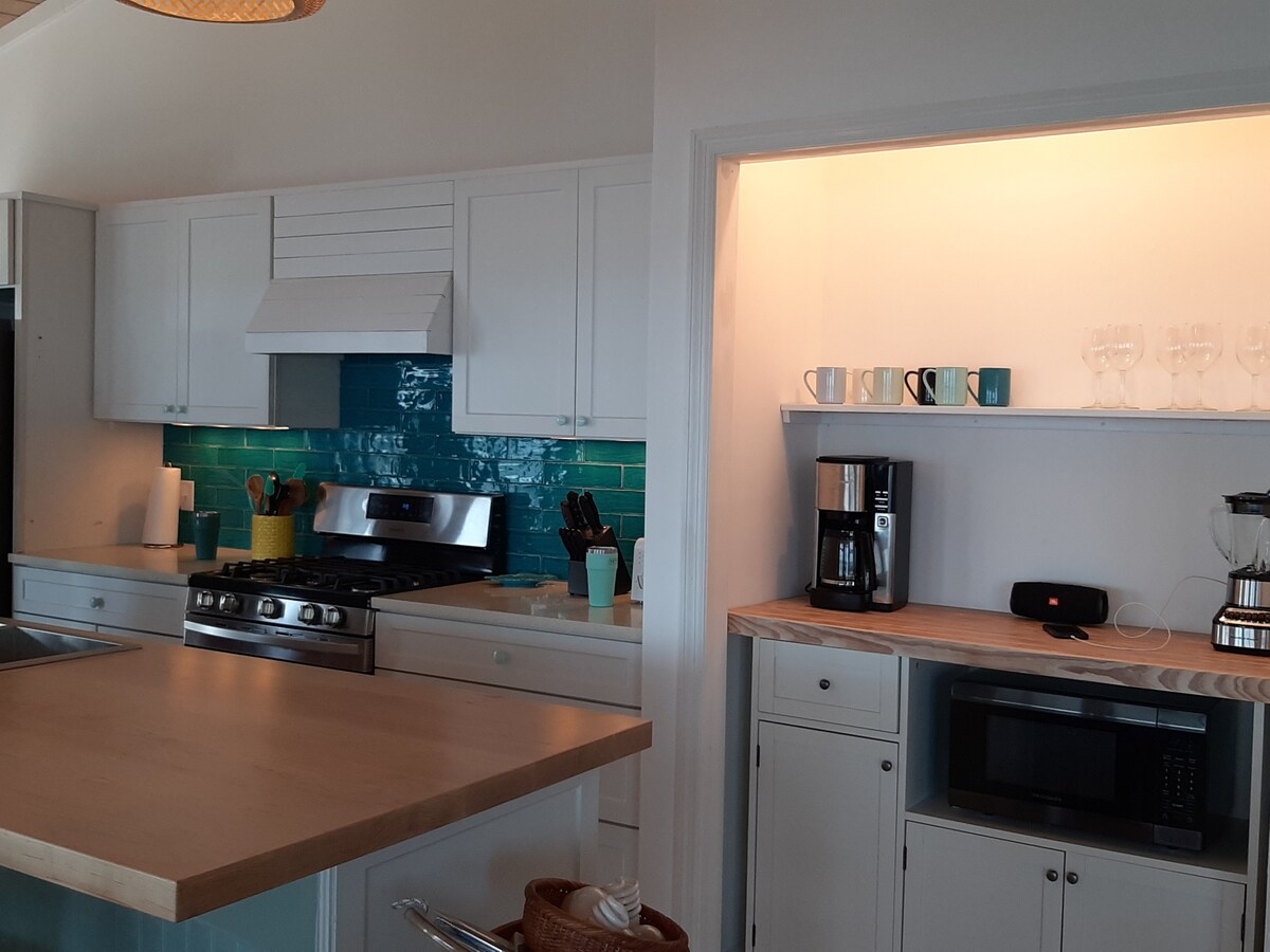 Forhøyet øyboende i en helt ny 2/2 strandhytte. Øybrisene er rikelige! Sentralt plassert med 360-utsikt over Long Bay, Bita Bay og White Sound. Under en minutt spasertur til Atlanterhavssiden av øya. Flere skjermede og åpne uteområder å nyte. Takterrassen har den høyeste utsikten på øya. Et åpent område for å nyte morgenkaffen eller et glass vin i solnedgangen. Du vil overse Bita Bay, Long Bay og White Sound. Du kan se på soloppgangen eller måle bølgeskiftet i vannet. Nyttig på veldig mange måter! Hovednivået i huset har et romslig soverom med en queensize-seng og et bad. Den store stuen i friluft har hvelvde tak og et tilstøtende kjøkken utstyrt med alt du trenger for å lage dine egne måltider. Du kan se på Direct TV eller DVD-er mens du lager mat. Like utenfor kjøkkenet og gjennom de franske dørene er det en stor veranda med et bord for å spise og spille spill. En propangrill står klar for deg til å grille dagens fangst. Ovenpå i andre etasje er hovedsoverommet ~ Suite Dreams. Den har en kingsize-seng, en koselig stol å krølle seg sammen i og en privat veranda med utsikt over Atlanterhavet. Det tilstøtende badet har en dobbel vask, og det er en fylt kaffestasjon, mikrobølgeovn og et minikjøleskap. Det er en veggmontert TV og mange DVD-er å se på. Huset er utstyrt med sterk trådløs internettforbindelse på alle nivåer.