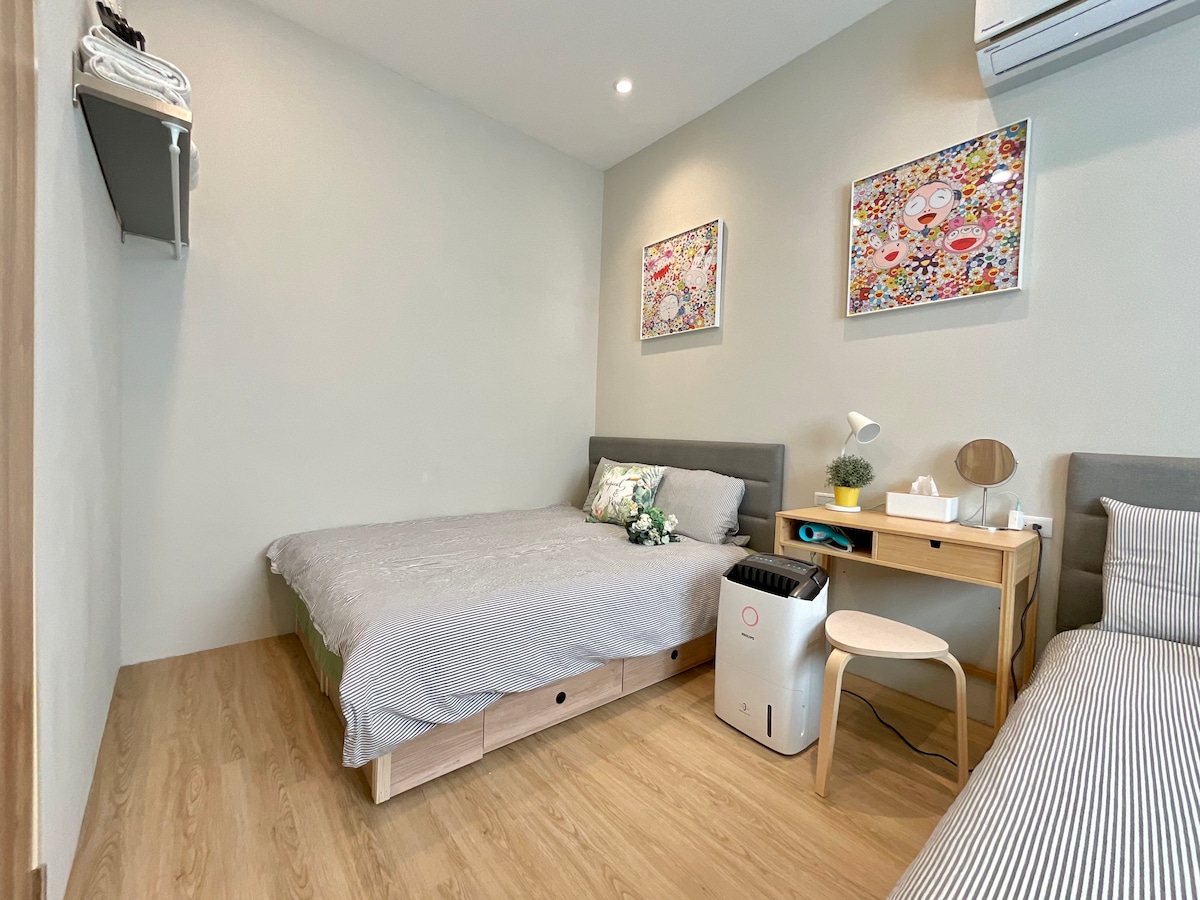 Ny Meilidao stasjon dobbeltseng 2-4 personer Plassert i sentrum av T-banen, ved siden av utgangen til R10 O6 Formosa Boulevard Station, med direkte tilgang til høyhastighetstog, Taiwan Railway, flyplass og T-baner i alle retninger, er det hovedtransportknutepunktet i Kaohsiung, og du kan nå overnattingsstedet etter å ha gått av. Gratis WiFi tilbys, bare 100 meter fra Liuhe Sightseeing Night Market, huset er omgitt av drikkebutikker, kafeer, banker, 7-11, frokost, lunsj, middag, kveldsmat, alle slags matbutikker, skjønnhetsbutikker, Ubike... alt du trenger for livet Hele bygningen er utleies uavhengig i ett plan, og rommet har en uavhengig utsikt med en stor terrasse med sofa, to standard dobbeltsenger, LCD-TV, og et privat bad med separat tørr og våt toalett. Fullt skjermet gardin, stikkontakt ved siden av sengen for å gi deg en mer komfortabel opplevelse. Hele enetasjes eksterne rom har et felles komplett kjøkken med kjøleskap, IH-ovn, mikrobølgeovn, hvor du kan vaske og skjære frukt, varme opp mat og lage enkel mat, slik at du har flere måter å oppleve mat på. ⚠️Terrassen har glassrekkverk uten skjerming, og kan ikke ta imot barn under 12 år. For din sikkerhet, vennligst send en melding for å konsultere andre passende utleiesteder hvis du har barn med deg.