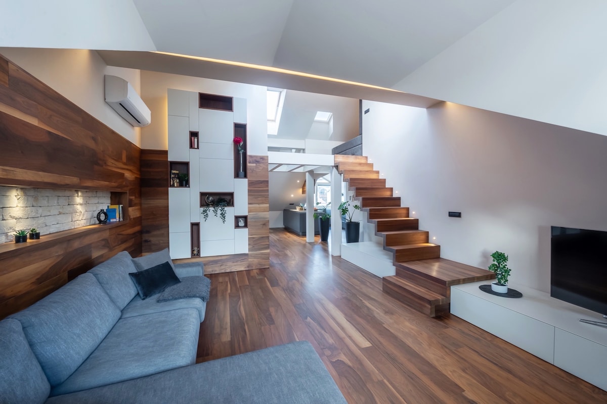 Nyoppusset åpen loftsleilighet med trebjelker og levende kunst, perfekt for fem gjester + en barneseng. Stilig, rent design med alle bekvemmeligheter: aircondition, TV, stort kjøkken og vaskemaskin. Ideelt plassert for å utforske Ljubljanas sentrum til fots, med enkel tilgang til tog- og busstasjoner i nærheten. Perfekt for familier eller små grupper som ønsker et unikt, eksklusivt opphold med god bekvemmelighet. Gratis frokost (ristet brød, syltetøy, smør, kjeks, frokostblanding, melk)