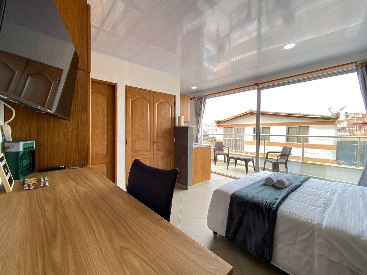 Fullt møblert suite på 28 m2, med aircondition og tekjøkken. Plassert i et av de beste områdene i Medellin, i et veldig rolig nabolag i nærheten av alle stedene av interesse. Suiten har spektakulær utsikt over byen og fjellene. Du kan bruke kontorfellesskapet, treningsstudioet og en spektakulær kaffe som tilbyr forskjellige typer drikke basert på den beste colombianske kaffen, du kan nyte drinken din på terrassen som ligger i andre etasje i bygningen.