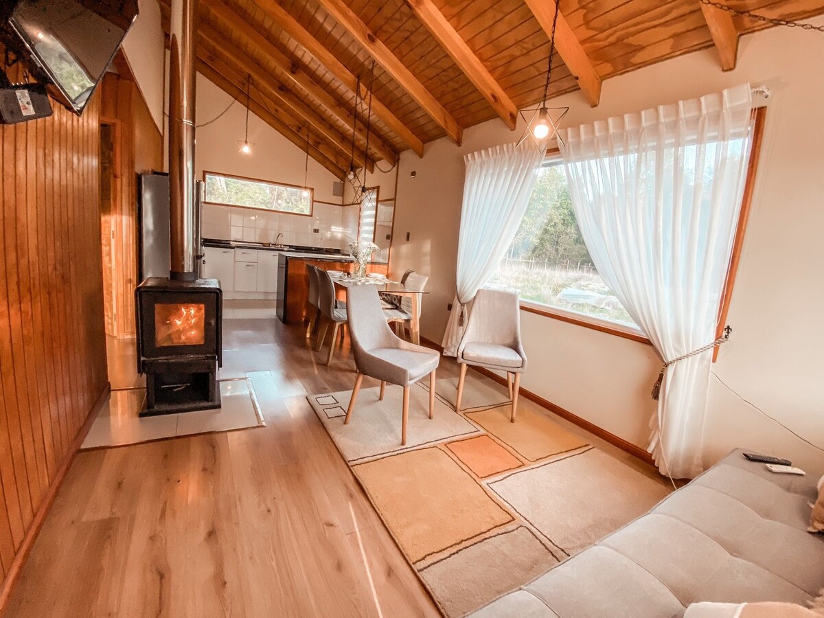 Hytte med plass til et par eller ett ektepar med to små barn, da vi har en sovesofa. Ligger på en privat tomt bare noen minutter fra sentrum av Puerto Varas. Utmerket tilkobling til Ruta 5 og bare noen minutter fra Llanquihue-sjøen og veien til vulkanen. Ideelt sted for hvile og avslapning, hvor vi også har alt du trenger hvis du må jobbe. Kjøkkenet har benkeplate (4p), minibar, elektrisk ovn og servise.