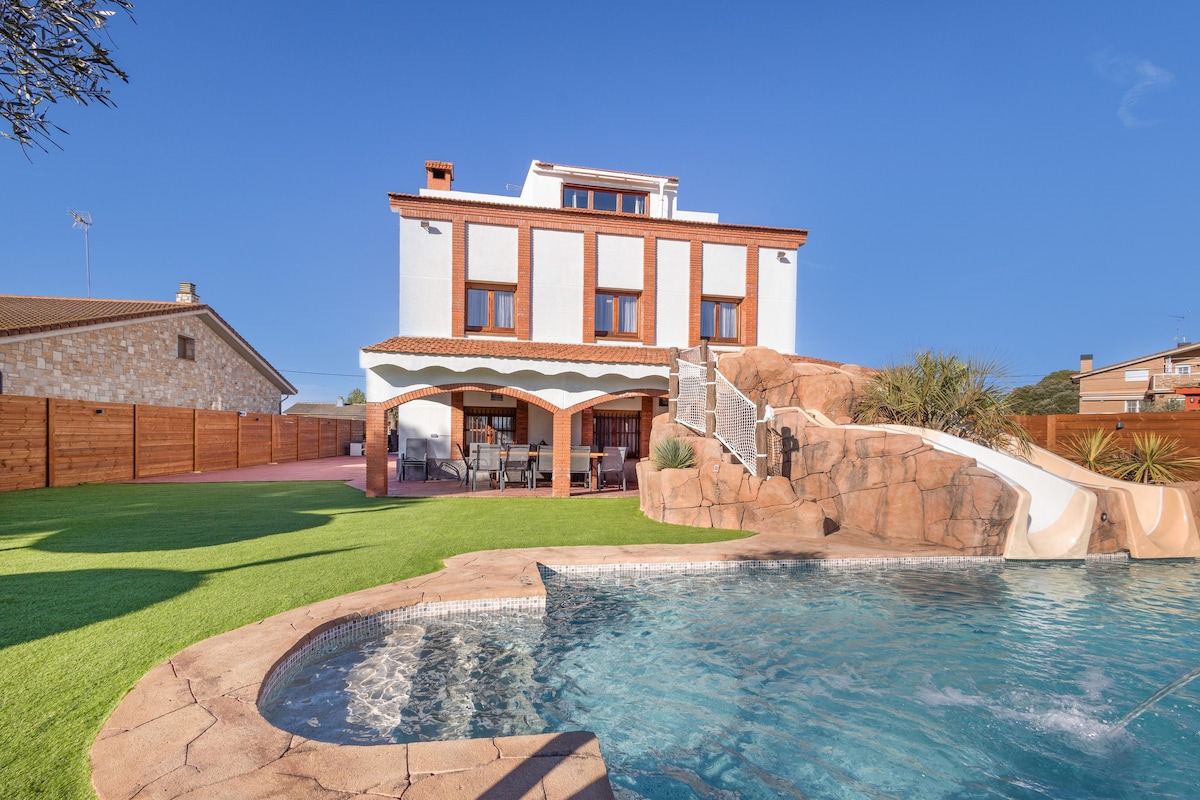 Magnificent villa Resort 420 m2 imponerende 12 m basseng. Full og privat utleie. 30 minutter fra Barcelona med bil. Ti minutters gange fra togstasjonen til Barcelona og alle tjenester og butikker. Ti rom med store terrasser og to rom på 45 kvm, alle med klimaanlegg. Private hager på 4500 m2, rustikt område med grill og fontene. PK for 10 biler. Spill Mulighet til å gjøre virtuell videosamtaleomvisning før du bestiller.