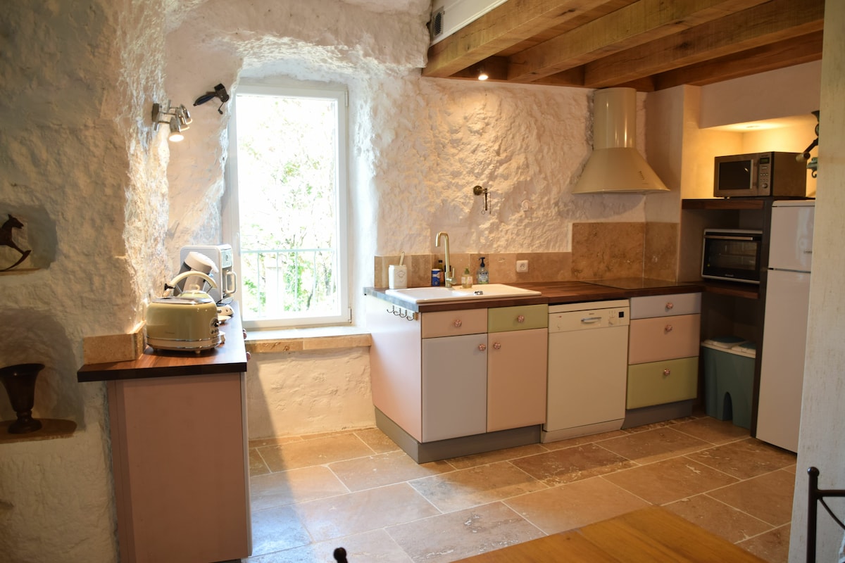 Troglodyte, atypisk, rolig i byen, hage + terrasse 1-4 pers. (1 seng + 1 sovesofa i stuen) Rom 1: Stue (1 sovesofa) -TV, spisestue, kjøkken, Område 2: 1 soverom, bad/toalett De to områdene er ikke forbundet, (du må gå gjennom den private uteplassen for å gå fra område 1 til område 2, og du må gå gjennom soverommet for å gå til toalett/bad). Tilgang til fots via smale trapper, gratis offentlig parkering, uten overvåkning 5 minutter til fots. Ingen WIFI. Sengetøy og håndklær følger med.