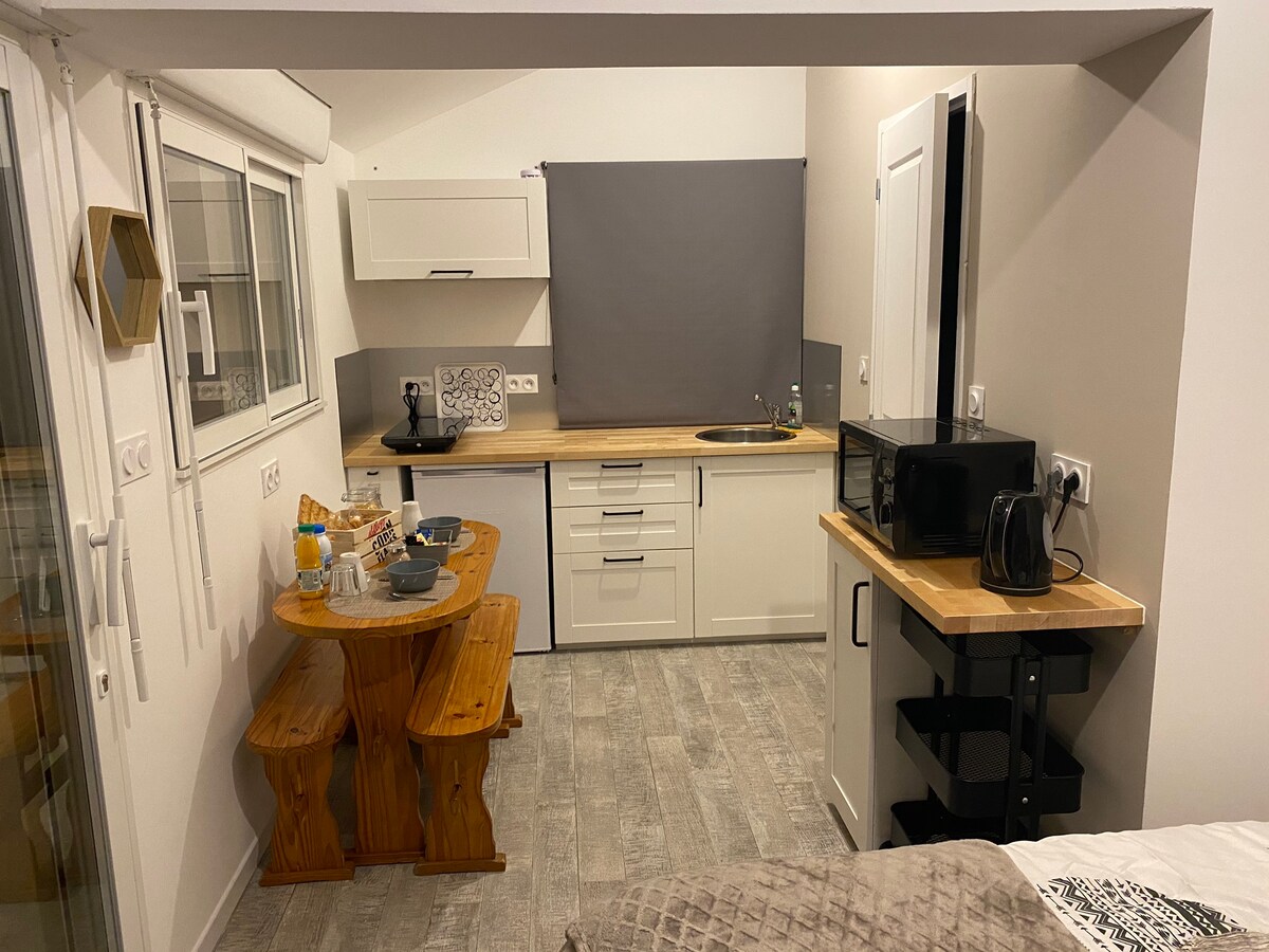 Kom og slapp av i denne hellige hytta, som ligger i hjertet av frukthagene i Sarthe! Vårt Tiny house er designet for at du skal kunne tilbringe en ekte flukt fra hverdagen sammen med din kjære, venner eller familie. Enten du beundrer solnedgangen eller stjernene i det nordiske badekaret, kan du nyte et unikt øyeblikk av avslapning. Tidlig om morgenen kan du nyte frokosten din (inkludert) på terrassen og i "kaffekroken".