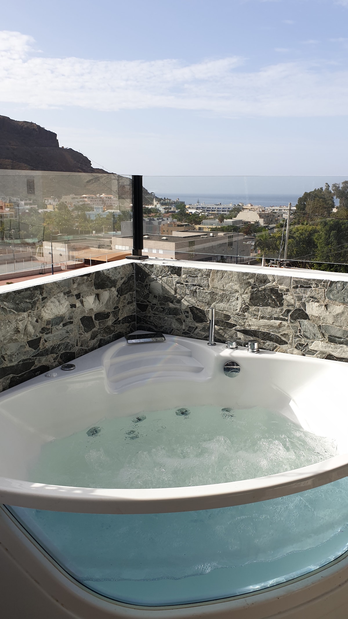 Nyt en luksuriøs opplevelse i dette sentrale overnattingsstedet, bare noen få skritt fra stranden og Puerto de Mogán. Toppleilighet med to soverom, med en terrasse på 80 m2, som tilbyr wifi, aircondition og Smart TV i alle rommene. Leiligheten er innredet med et høyt nivå av detaljer, slik at du kan føle deg som hjemme. Utsikten over fiskerlandsbyen, boblebadet, den unike terrassen og de forskjellige rommene gjør dette til en eksklusiv leilighet i området.