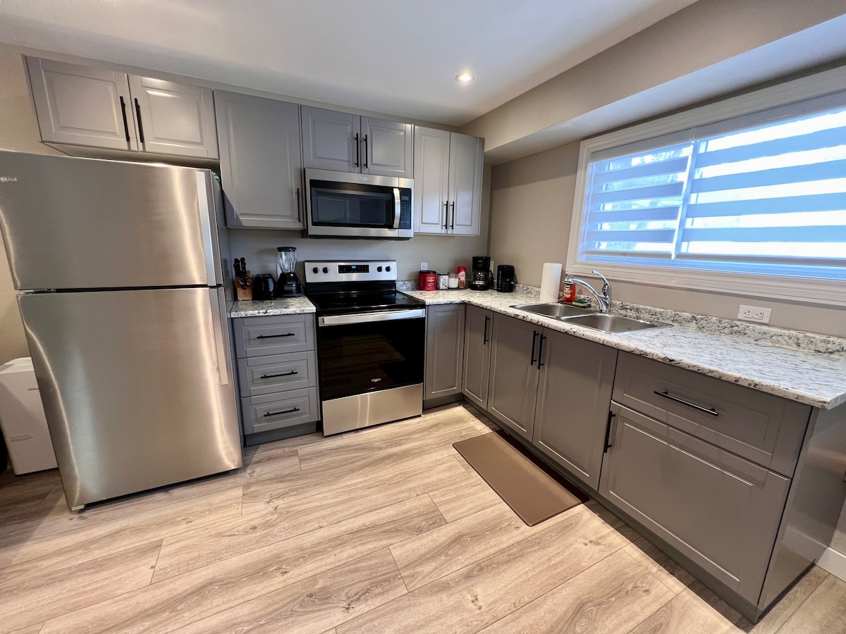 Vi har en stilig og romslig leilighet med ett soverom i første etasje som passer for opptil to personer. Fullt utstyrt kjøkken og stue. Sentralt beliggende nær sentrum (pass på hvis du sover lett), bare kvartaler unna hovedgaten, banker, havnen, kino, butikker, restauranter og kaffebarer. Ett kvartal unna LOTW Brewing Company, postkontoret og No Frills. ** Bestilling fra tredjepart kan kanselleres og krever forhåndsgodkjenning. **