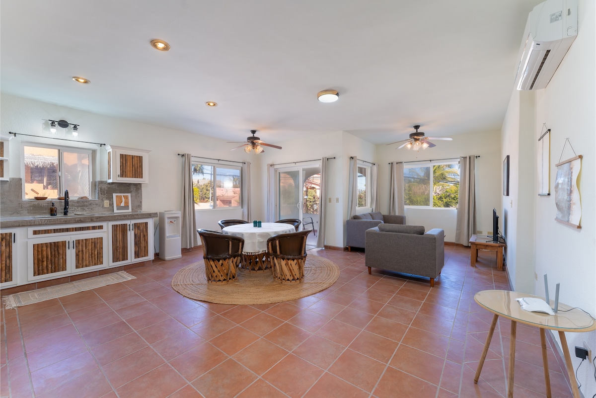 HELT NY 1 soverom, 2 komplette bad i Downtown Loreto på en rolig gate med kort gangavstand fra stranden, Mission, museer, restauranter, supermarkeder, banker, apotek og til og med en klinikk i nærheten for rask Covid-19-testing. Innredningen er svært unik og levende, med lokal stein, skog og finish, samtidig som den gir deg den smaken av Mexico =) Det er det perfekte stedet for reisende som trenger den lille ekstra plassen, eller separat soveplass uten å betale for to separate rom!!