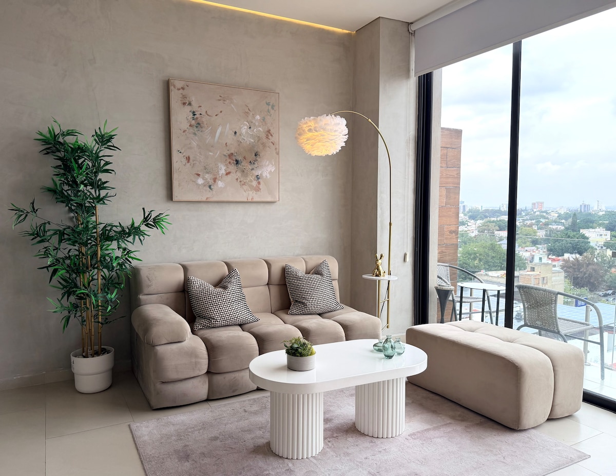 Luksuriøs og vakker leilighet med art deco-design og møbler, slapp av og nyt utsikten fordi det ligger i 9. etasje, den har fasiliteter som naturskjønt basseng, treningsstudio, panoramatak, sosialt rom, grillgriller, sikkerhet og heiser. Leiligheten har ett rom med en en queen size-seng, ett fullt bad, vaskerom, fullt kjøkken, kjøleskap med ismaskin og dispenser for kaldt vann. Vi tilbyr 2 håndklær for dusj og 2 håndklær til bassenget. Vi tilbyr også turer til by og magiske byer.