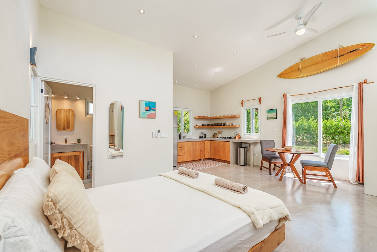 Små, nye bungalower i loftsstil én km fra Playa Negra. Privat og fullt utstyrt for at du skal kunne nyte turen komfortabelt. Vi har en privilegert beliggenhet i nærheten av de vakreste strendene, som Avellanas, Junquillal og Playa Negra (to minutter med bil), en av de beste bølgene i Costa Rica. Det er også gangavstand til restauranter og minimarkeder. Den har høyhastighets trådløst nettverk, aircondition, utstyrt kjøkken, queensize-seng, privat bad med varmt vann og egen terrasse. Felles basseng