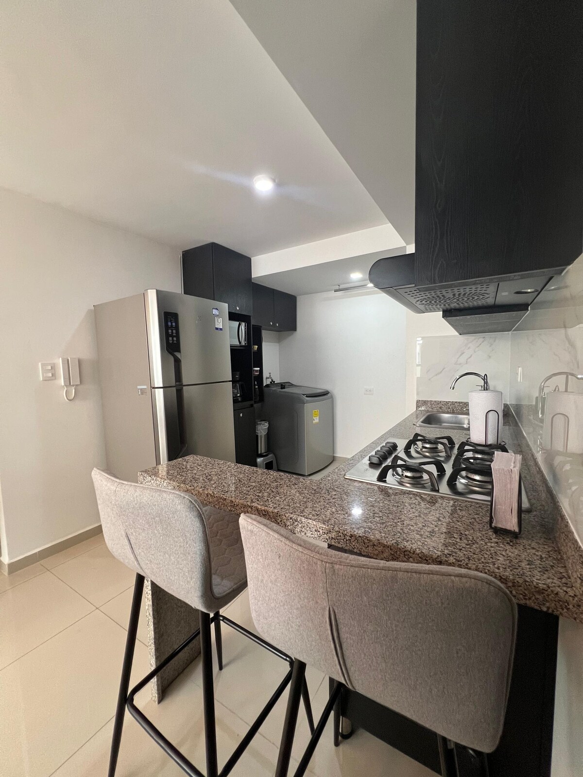 Fullt møblert og utstyrt leilighet for å gjøre oppholdet ditt veldig komfortabelt. Vi har omgivelser som Makro, nattklubber, restauranter, Éxito-butikk, enkel tilgang uten behov for transport. I komplekset har vi et svømmebasseng, treningsstudio, concierge og barnepark. Maks kapasitet på fem personer fordelt som følger: Hovedsoverom med klimaanlegg, TV, privat bad, dobbeltseng. Rom 2 med vifte og to enkeltsenger. Rom 3: vifte og én enkeltseng.