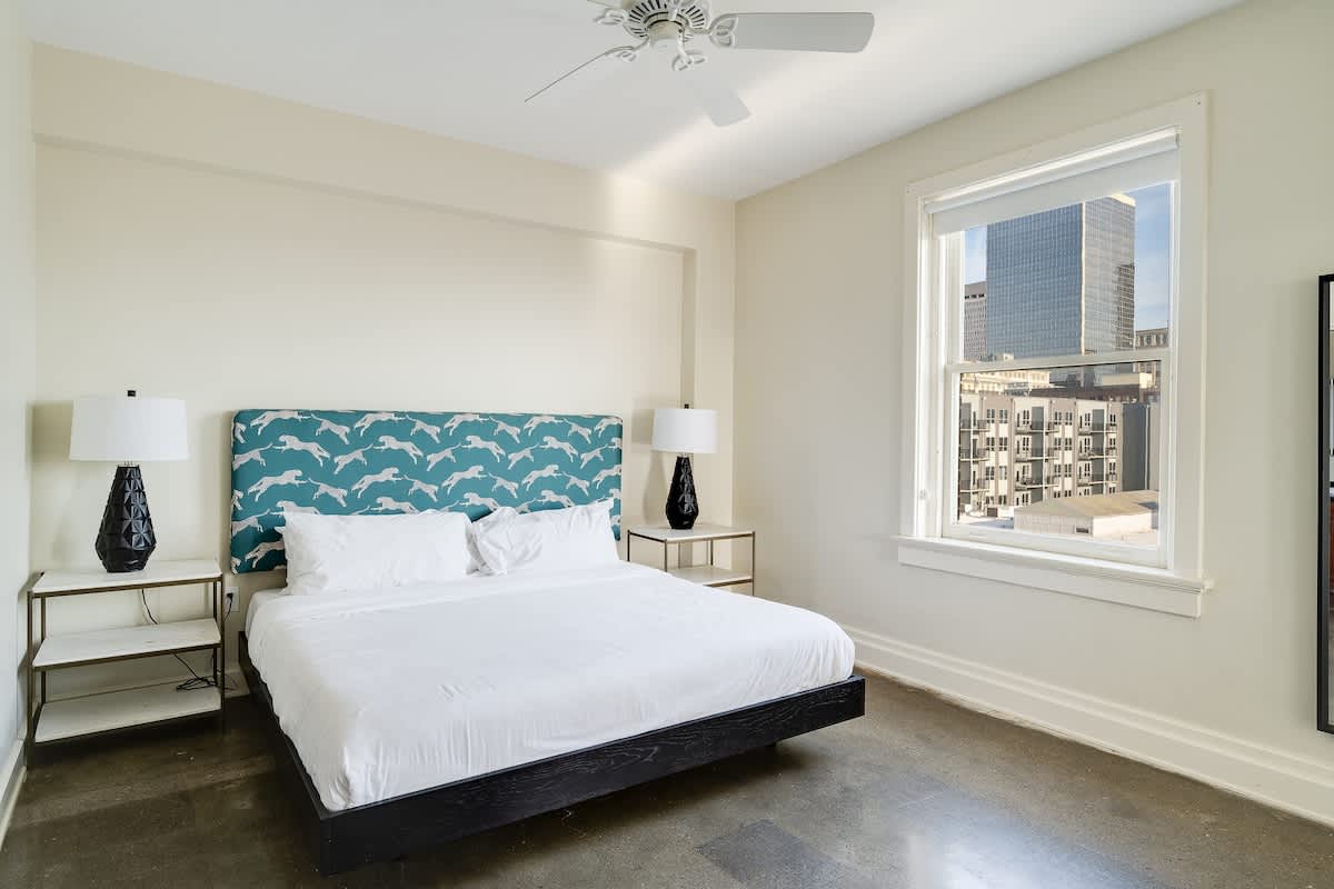 Unwind and enjoy sweeping river views on the rooftop patio while staying in this private 5th floor Penthouse apartment. Intentionally designed and decorated. Features include: a full upscale kitchen, open concept living and dining area, cozy King bed, large plush bathroom, and laundry in the suite. Whether visiting for work or pleasure, this spacious urban suite is located on The Bourbon Trail and within walking distance to Louisville's most popular venues!