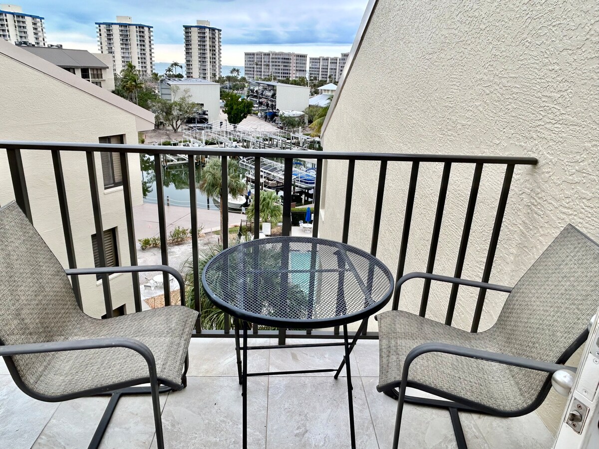 Vår vakre leilighet med ett soverom ligger direkte på en privat, hvit sukkerstrand med vakker utsikt over golfen og bukten fra en privat balkong. Moderne fasiliteter og nye møbler, inkludert to 40"smart-TV med flatskjerm. Nyt det oppvarmede svømmebassenget, gassgrillene og den ikke overfylte stranden vår, med den nydelige Lovers Key State Park-stranden direkte tilknyttet vår. Enkel tilgang til shopping, spisesteder og tralle. Det finnes mange aktiviteter/vannsport her eller bare slapp av. Se etter delfinene!