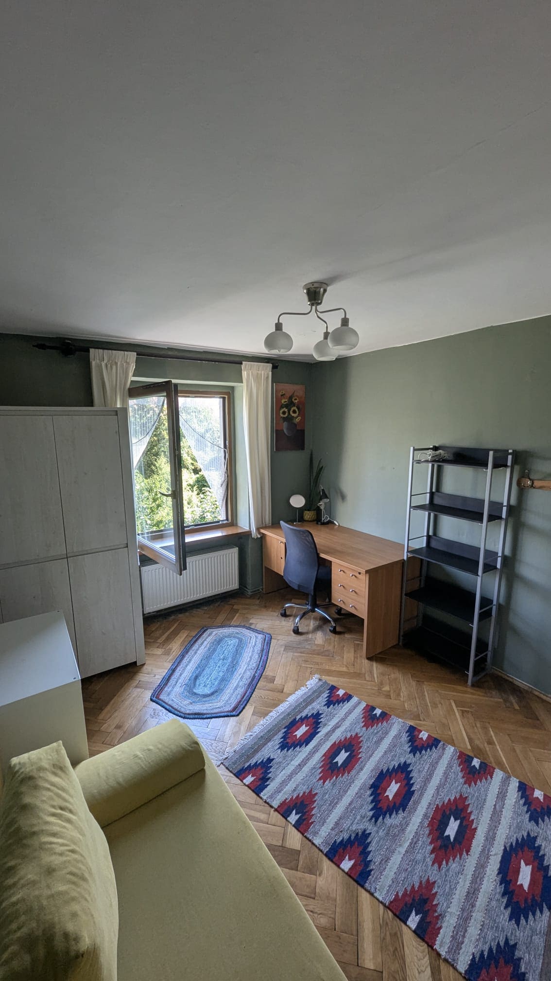 Stor og solrik loftsleilighet på 45 kvm med mesanin . Nyrenovert med kunstnerisk sjel. Jeg tilbyr hele leiligheten med et lite bad og tekjøkken. Beliggende i et grønt og rolig område 15 minutter fra sentrum. Passer for fire personer - to dobbeltsenger.