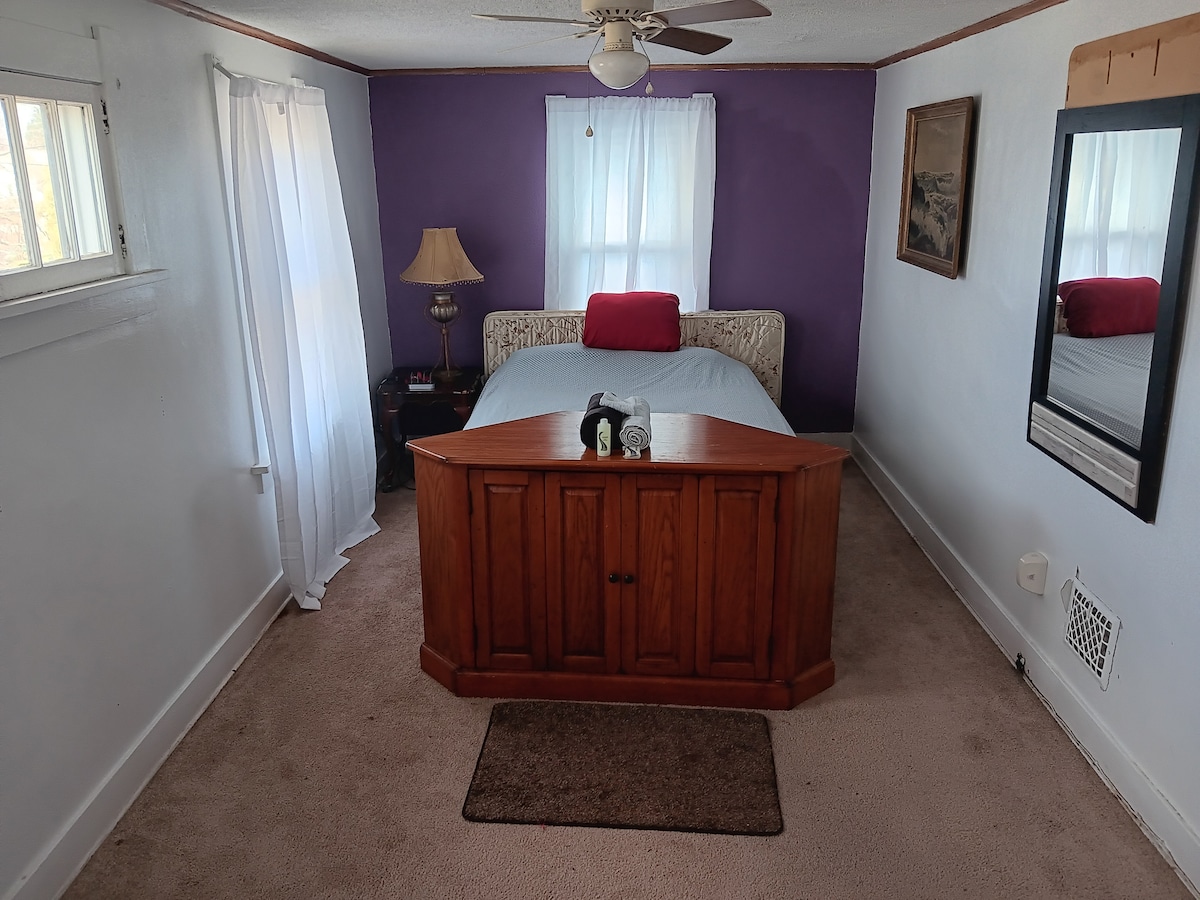 Nøkkelboksinngang til den helt private inngangen kjellernivå inkluderer; sitteplass med sofa, stol, stor skjerm Fire TV/; WiFi/ peis; queensize-seng og kiste. (Sammenleggbar seng tilgjengelig). Et separat siderom inkluderer en privat dusj, vask, spiseområde med bord og stoler, kjøleskap, brødrister, mikrobølgeovn og kaffetrakter; (lett frokost inkludert). Det private halve badet ligger i hovedetasjen øverst i trappen inne i inngangspartiet. Privat parkeringsplass foran hjemmet.
