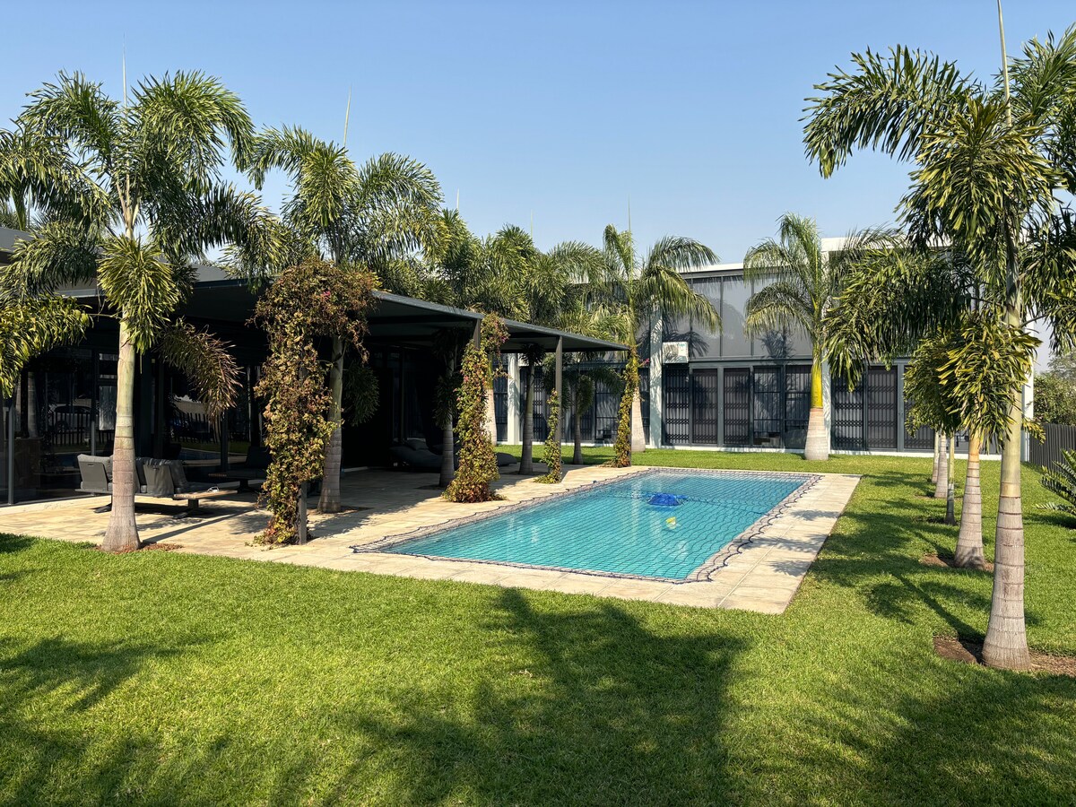Sjarmerende, moderne gårdsvilla som ligger 30 minutter fra Kenneth Kaunda internasjonale lufthavn. Tilgang til fem kjøpesentre, restauranter og forretningsfasiliteter. Et ideelt sted for besøkende som ønsker en øy med fred og ro, i byen. Fullt utstyrt med ett soverom, bad, dusj, kjøkken, stue og mikrotreningsstudio. Omgitt av frodige naturlige hager, noe som gir deg god plass til å ta rolige turer innenfor sikkerheten av området. Reservekraft inkludert #TIA