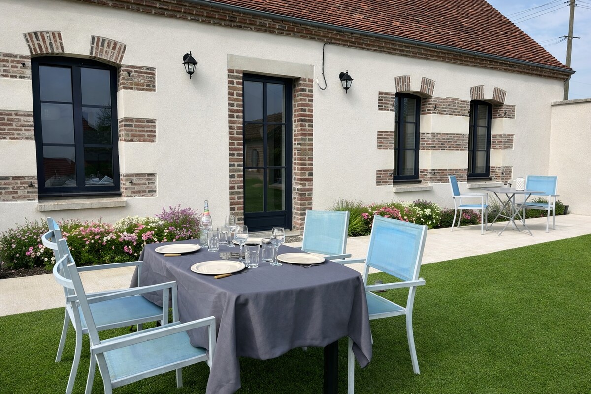 I en grønn oase, kan du nyte et romslig og fullt utstyrt for 2 til 7 personer. Den har 3 soverom, 2 bad, 2 toaletter, en stue med stor TV, en spisestue og et veldig godt utstyrt kjøkken. Stor terrasse, Wi-Fi. Beliggende i naturparken Orient-skogen, 5 km fra innsjøene, sykkelstier, i nærheten av Nigloland, golf i Orient-skogen. 15 km fra Troyes og fabrikkutsalg. Sengetøy og håndklær er inkludert