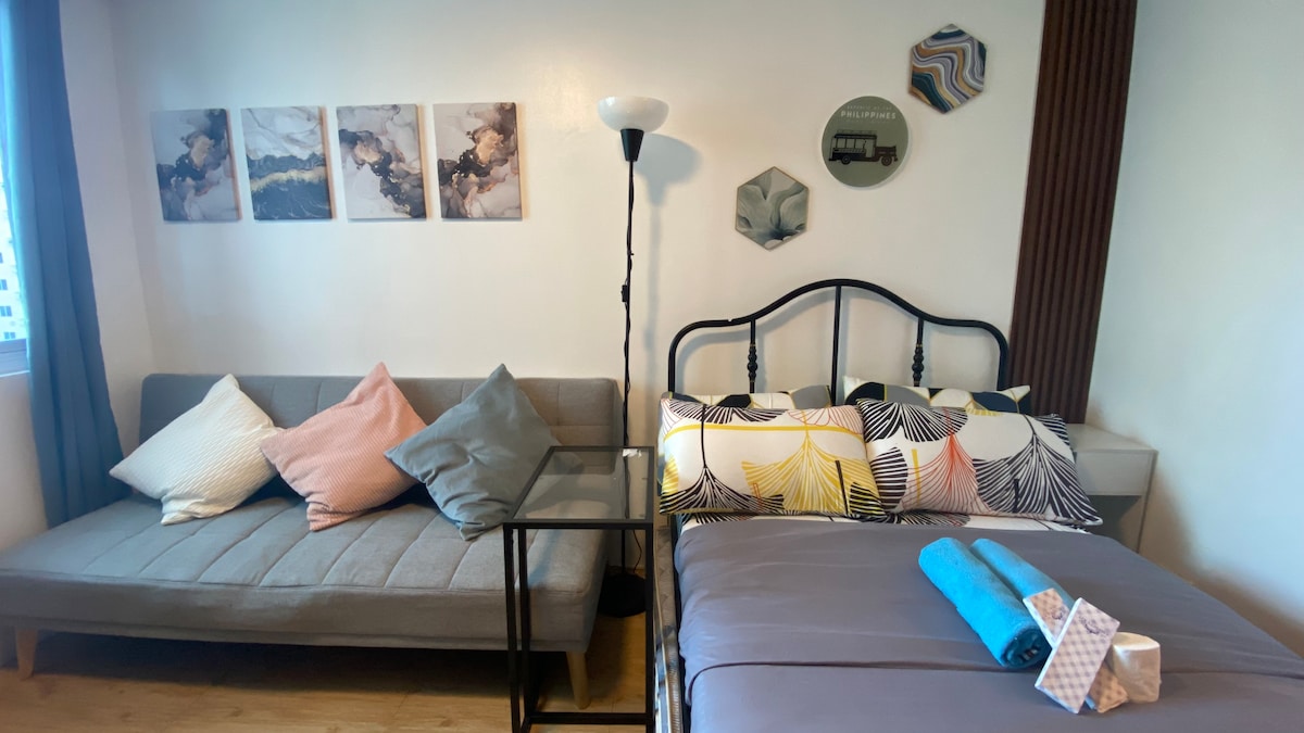 Velkommen til denne hyggelige studioenheten i Quezon City, ditt perfekte tilfluktssted! Stedet har en komfortabel dobbeltseng, en 55-tommers smart-TV med Netflix, Disney+ og HBO Go, sammen med en lenestol, et kompakt, men fullt utstyrt kjøkken og et stilig oppholdsrom som er perfekt for å slappe av etter en dag med utforskning. Med kaféer, restauranter og attraksjoner bare noen skritt unna, enten du er her for forretninger eller fritid, lover denne studioen et herlig opphold i hjertet av byen.