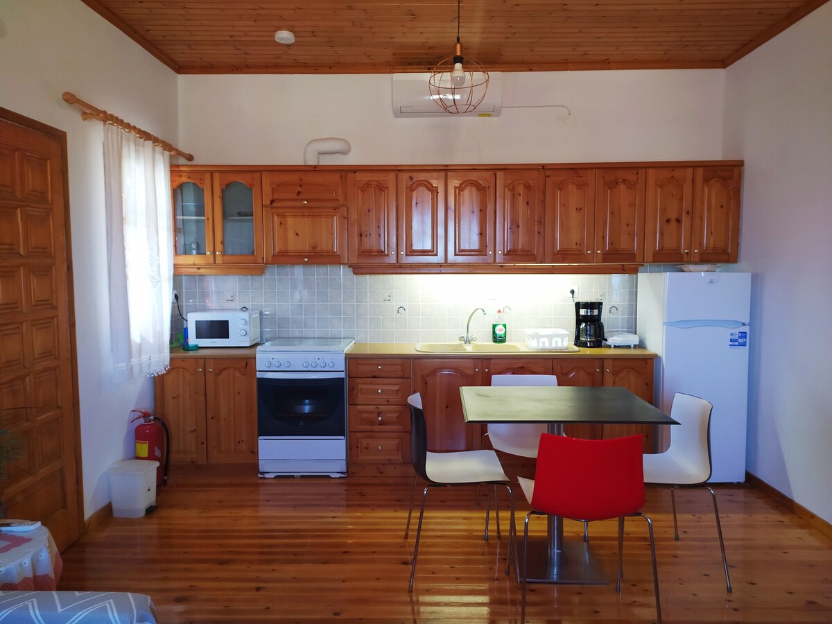 Det er et komfortabelt, nylig renovert hus i første etasje! Huset er fullt av trær og tilbyr en fantastisk utsikt over fjellet!!! Den ligger i Kissos (en av de mest naturskjønne landsbyene i Pillion)! Det er ideelt for familier, par, venner og for alle som ønsker å kombinere sjø med fjell!! Huset ligger én time unna Volos!!